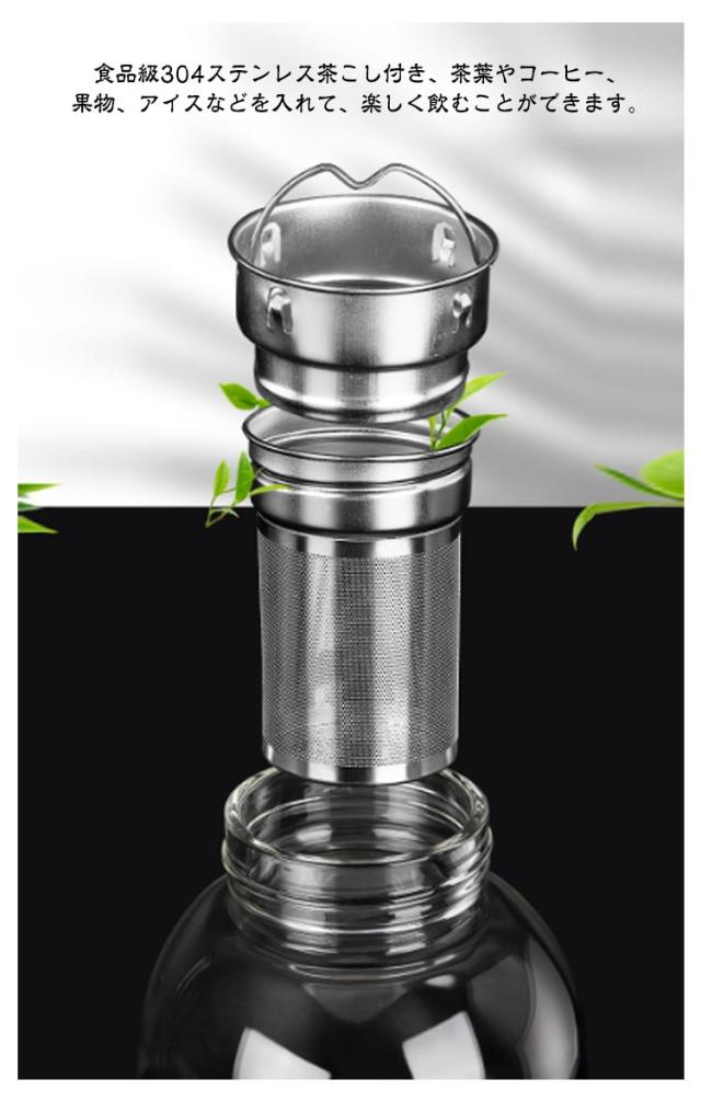 | 5サイズ選択可 ボトルが美しく仕上がっているので、持ち出して人前でも使えます。 マルチユース:お茶、温かい飲み物と冷たい飲み物、水、フルーツ入りの水に適しています。 耐久性:漏れ防止。 耐熱衝撃性。 保護スリーブ。 ブラシ付き、簡単に洗うと、綺麗になります。 高品質ホウケイ酸ガラス性硬質かつ耐熱性を備え、高品質な水筒であります。 蓋付きの場合に、飲み物をしっかり保護できるし、飲みやすくなります。 食品級304ステンレス茶こし付き、茶葉やコーヒー、果物、アイスなどを入れて、楽しく飲むことができます。 職場・学校・スポーツジム・ジョギング・キャンプ・旅行などなど最適。 | |