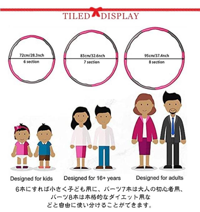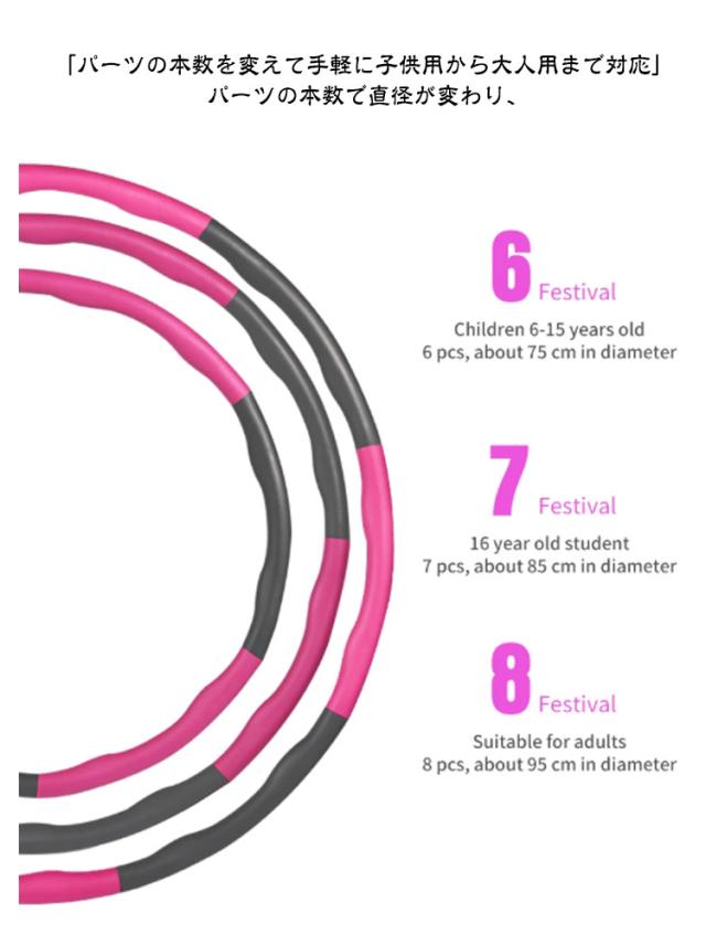 | 大人用/子供用 美しいウエスト作りに!体幹が鍛えられるので、お腹やせしたい方に特におすすめです! ソフトスポンジ素材なので痛くなりにくく、大きすぎない凹凸がお腹周りをやさしく刺激します。 短時間で効率的なカロリー消費が可能で、テレビや音楽を楽しみながら、いつでもどこでも気軽にダイエットできます。 「簡単組み立て・持ち運び便利なデザイン」 6/7/8本のジョイント式パーツで、簡単に組み立てや分解が可能。 コンパクトに収納できるため、家庭はもちろん、職場やジム、公園など、あらゆる場所で使用でき便利です。 「パーツの本数を変えて手軽に子供用から大人用まで対応」 パーツの本数で直径が変わり、 6本にすれば小さく子ども用に、パーツ7本は大人の初心者用、 パーツ8本は本格的なダイエット用などと自由に使い分けることができます。 | |
