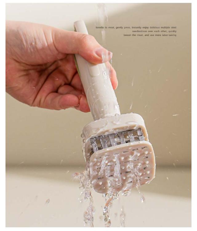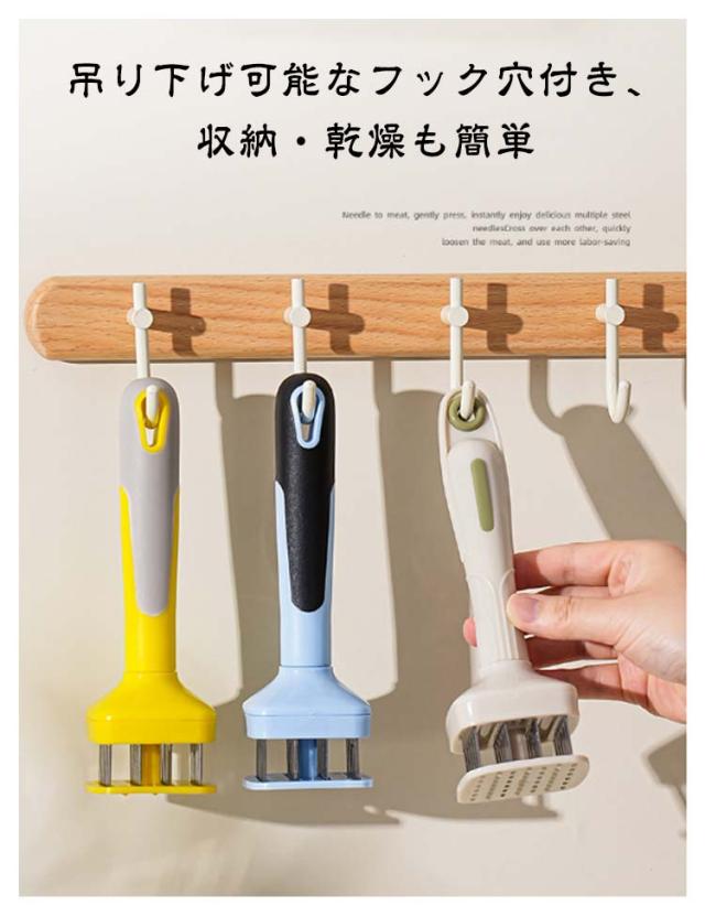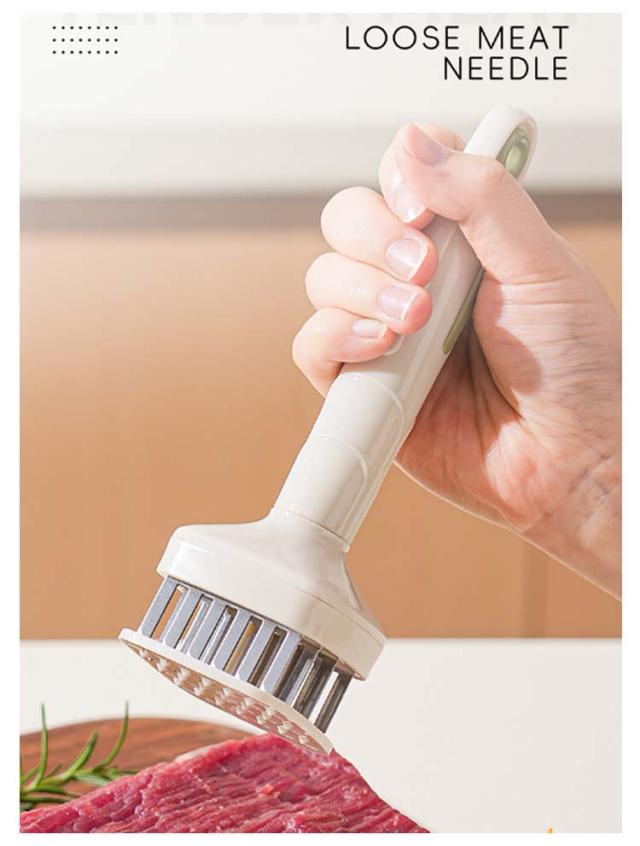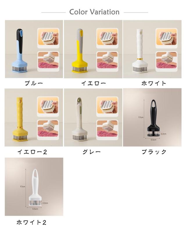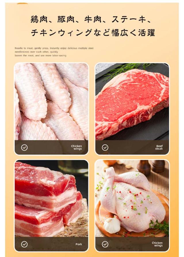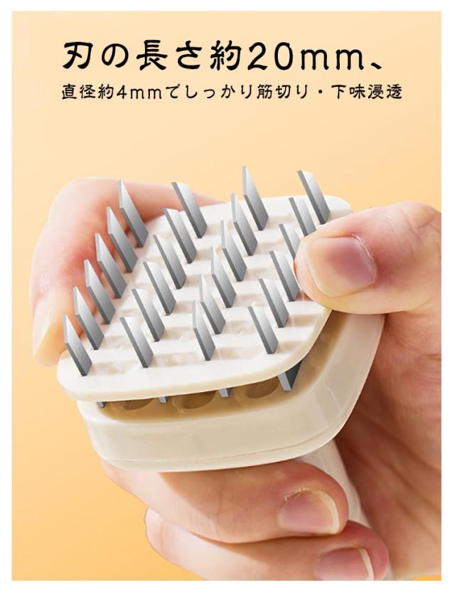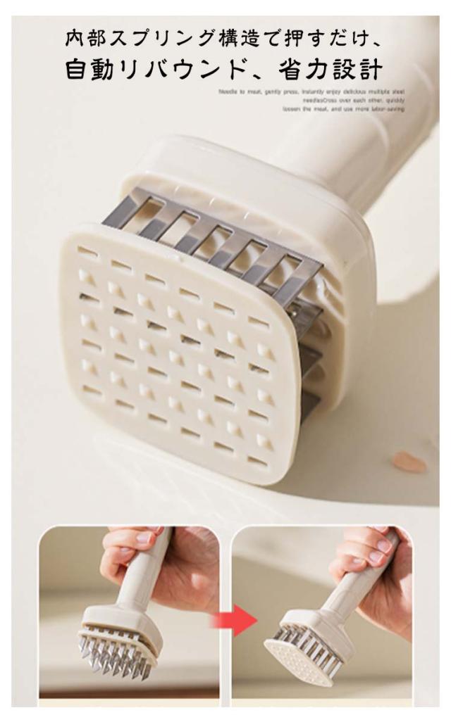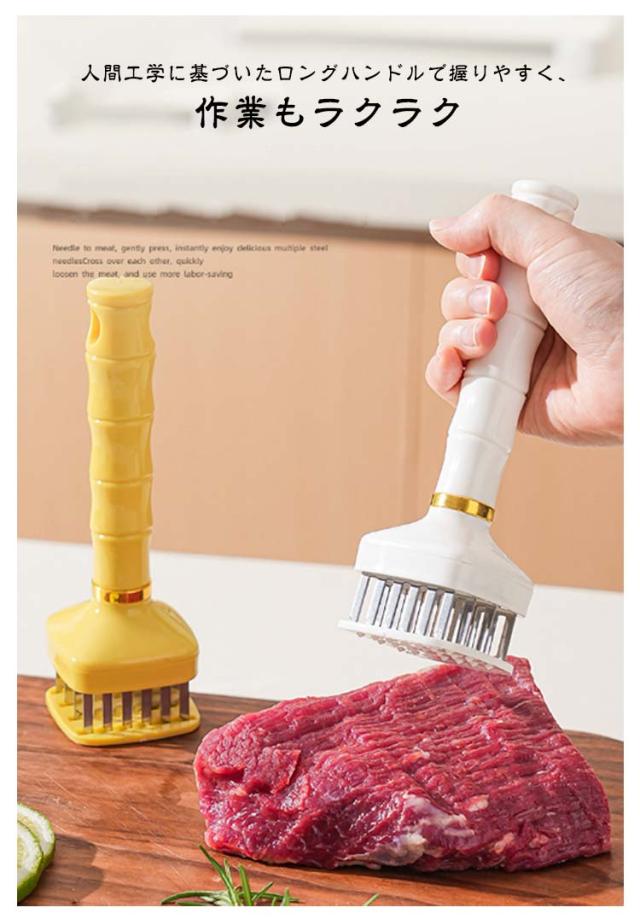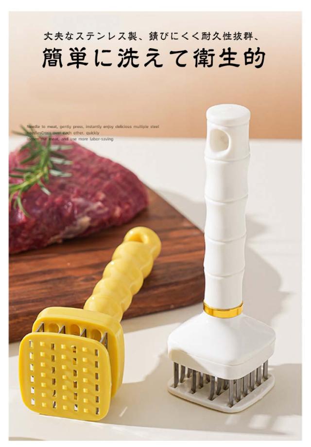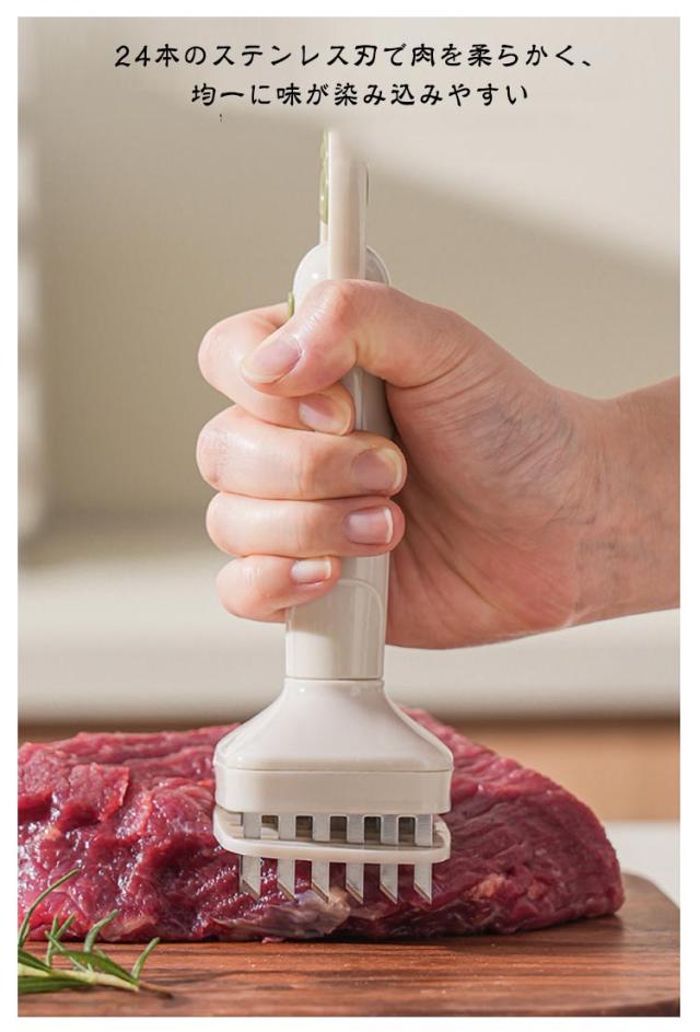 | ステンレス製 肉筋切り器 24本刃 簡単操作 24本のステンレス刃で肉を柔らかく、均一に味が染み込みやすい 刃の長さ約20mm、直径約4mmでしっかり筋切り・下味浸透 内部スプリング構造で押すだけ、自動リバウンド、省力設計 丈夫なステンレス製、錆びにくく耐久性抜群、簡単に洗えて衛生的 鶏肉、豚肉、牛肉、ステーキ、チキンウィングなど幅広く活躍 人間工学に基づいたロングハンドルで握りやすく、作業もラクラク 吊り下げ可能なフック穴付き、収納・乾燥も簡単 | |