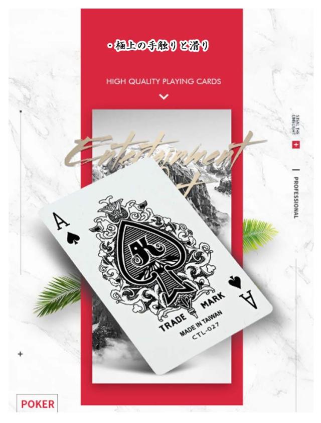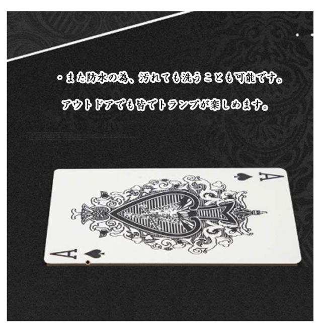| ・オシャレでカッコイイプラスチックカードトランプ ・極上の手触りと滑り ・丈夫なPVCを使用しており紙製に比べ丈夫です。 ・また防水の為、汚れても洗うことも可能です。アウトドアでも皆でトランプが楽しめます。 ・是非味わってください。 | |