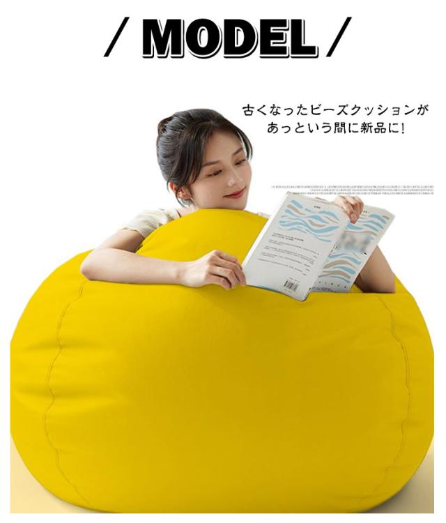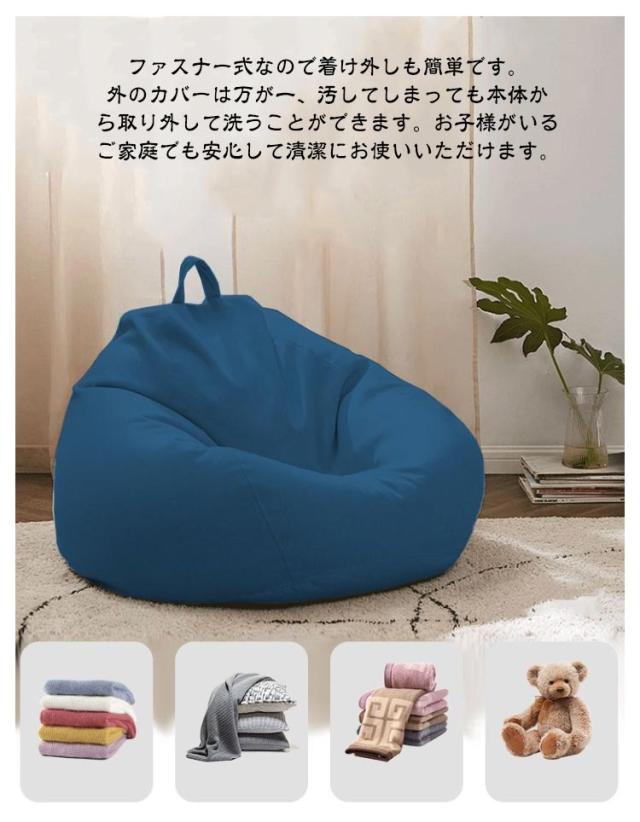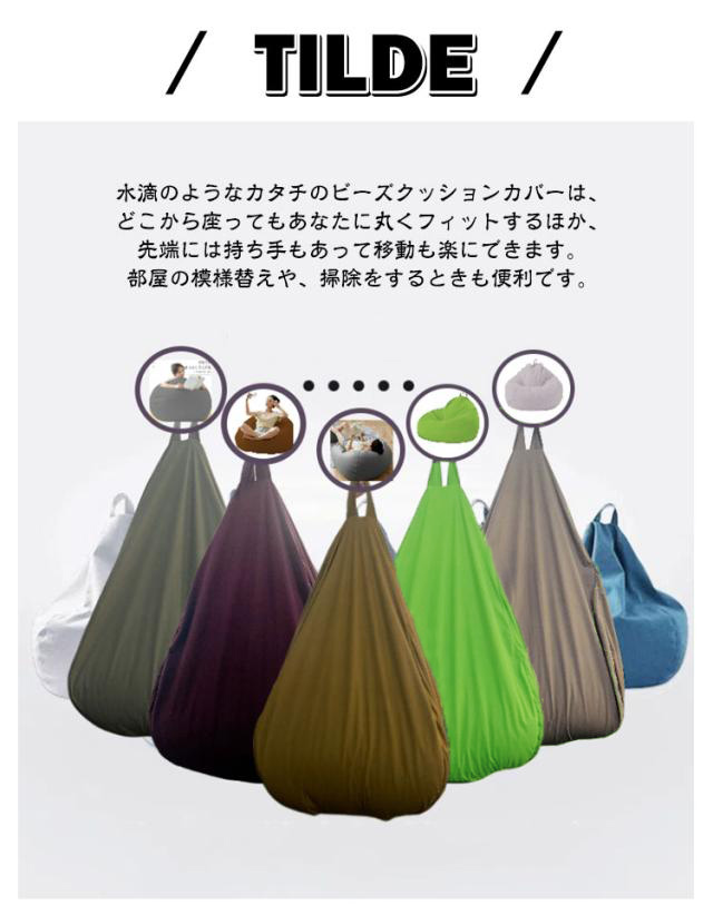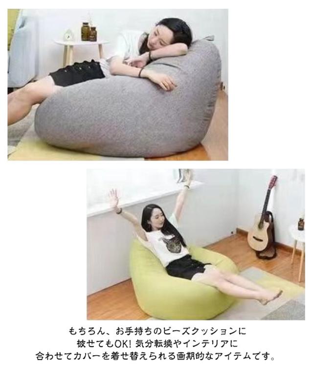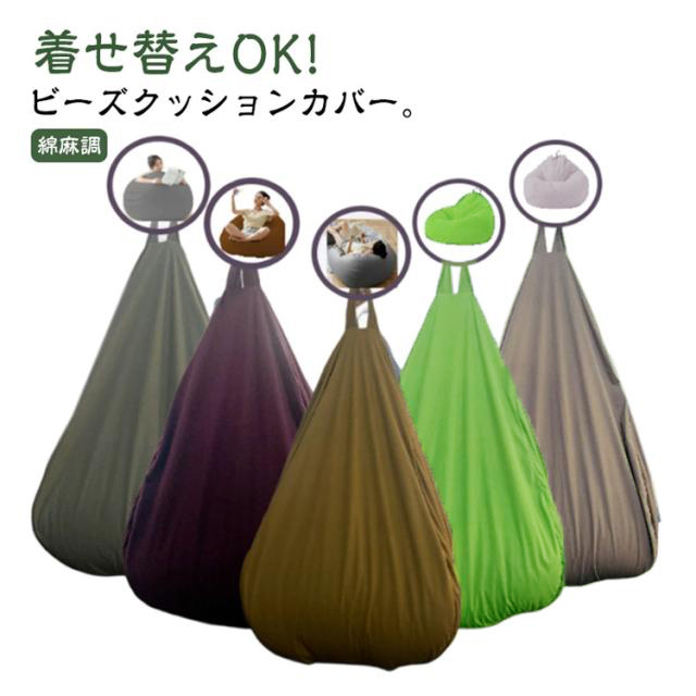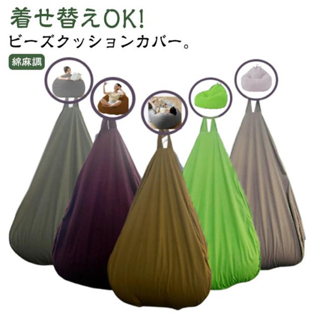 | 着せ替えOK! ビーズクッションカバー。【綿麻調】 古くなったビーズクッションがあっという間に新品に! もちろん、お手持ちのビーズクッションに被せてもOK! 気分転換やインテリアに合わせてカバーを着せ替えられる画期的なアイテムです。 水滴のようなカタチのビーズクッションカバーは、どこから座ってもあなたに丸くフィットするほか、先端には持ち手もあって移動も楽にできます。部屋の模様替えや、掃除をするときも便利です。 ファスナー式なので着け外しも簡単です。外のカバーは万が一、汚してしまっても本体から取り外して洗うことができます。お子様がいるご家庭でも安心して清潔にお使いいただけます。 特殊な縫製技術により、伸縮性と強度のバランスが良好で耐久性もいいです。通気性がよいので、蒸れにくいものがほしい人にも向いています。 | |