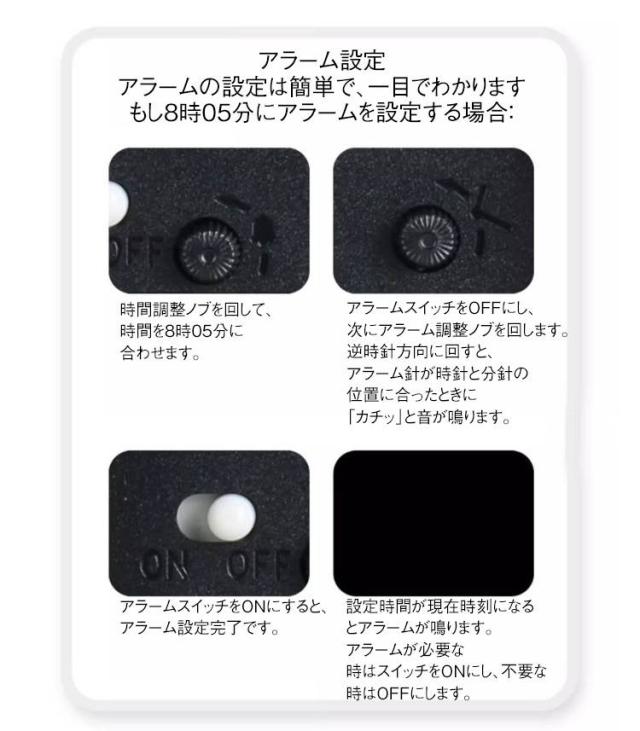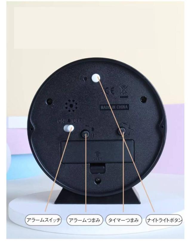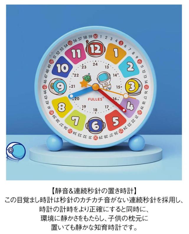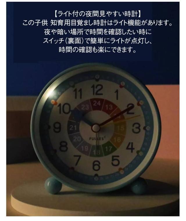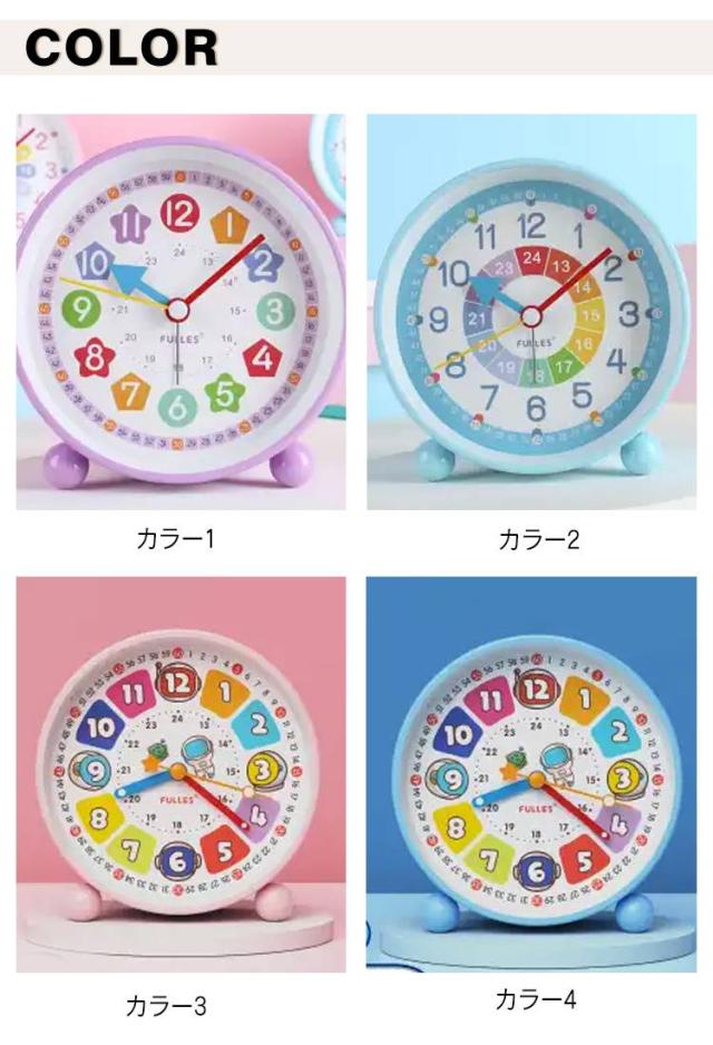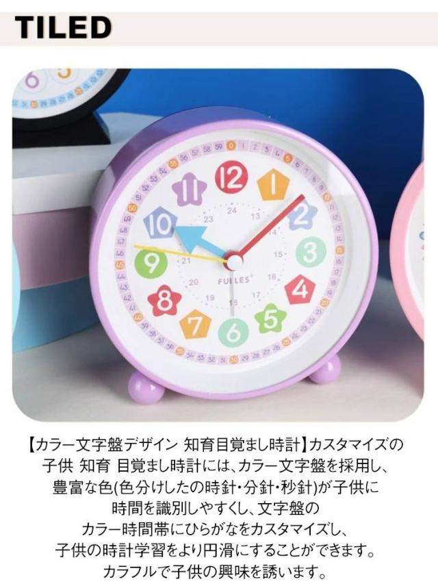 | 子供向けの目覚まし時計 5タイプ アラーム付 【カラー文字盤デザイン 知育目覚まし時計】カスタマイズの子供 知育 目覚まし時計には、カラー文字盤を採用し、豊富な色(色分けしたの時針・分針・秒針)が子供に時間を識別しやすくし、文字盤のカラー時間帯にひらがなをカスタマイズし、子供の時計学習をより円滑にすることができます。カラフルで子供の興味を誘います。 【静音&連続秒針の置き時計】この目覚まし時計は秒針のカチカチ音がない連続秒針を採用し、時計の計時をより正確にすると同時に、環境に静かさをもたらし、子供の枕元に置いても静かな知育時計です。 【ライト付の夜間見やすい時計】この子供 知育用目覚まし時計はライト機能があります。夜や暗い場所で時間を確認したい時にスイッチ(裏面)で簡単にライトが点灯し、時間の確認も楽にできます。 【時間管理用アラーム機能時計】この学習用アナログ時計はアラーム機能があります。アラーム設定がとても簡単です。子供が定時に起きる、学ぶ或いは遊びのより良い生活習慣を育てることができます。子供の時間管理に便利な学習時計です。 | |
