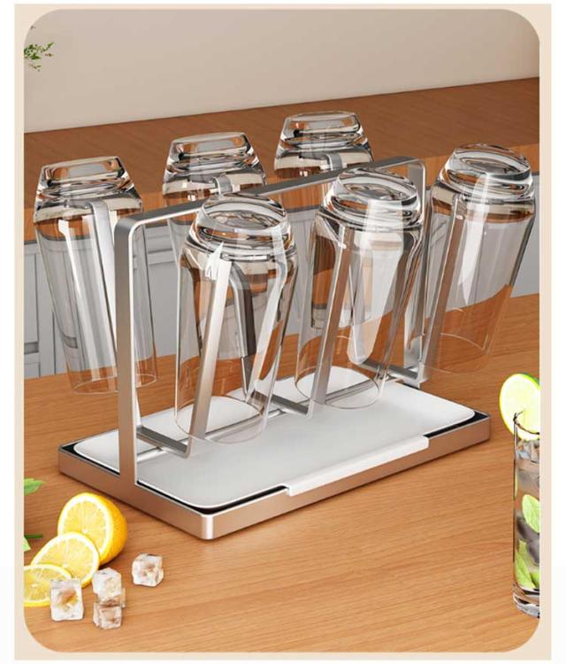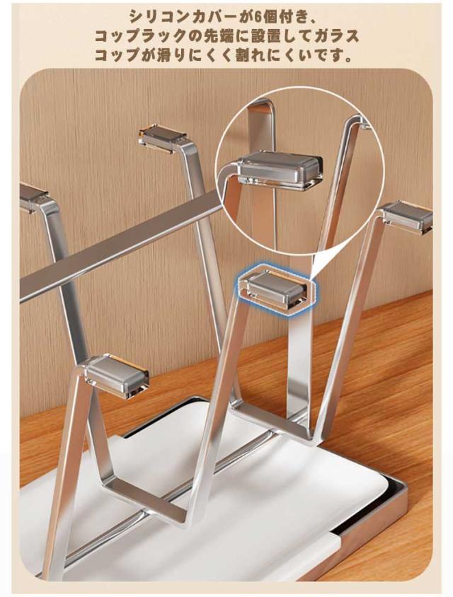 グラススタンド キッチン収納 ステンレス製 6個掛け 水切りラック コップホルダー コップ立て コップスタンド グラス置き トレイ 付き 乾燥用 滑り止め付 省スペース グラススタンド キッチンツール お洒落