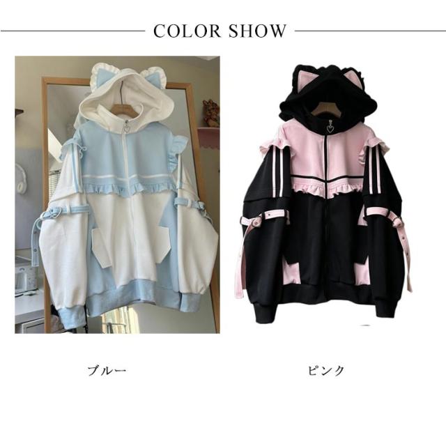 天使界隈 ジップアップ 量産型 パーカー パンク系 サブカル系 地雷系 レディース Y2K 服 メンズ 猫耳 長袖 春 秋 冬 コート 姫系 アウター 病みかわいい ゆったり 配色 切り替え フリル フードつき ストリート系 ギャル服 運動服