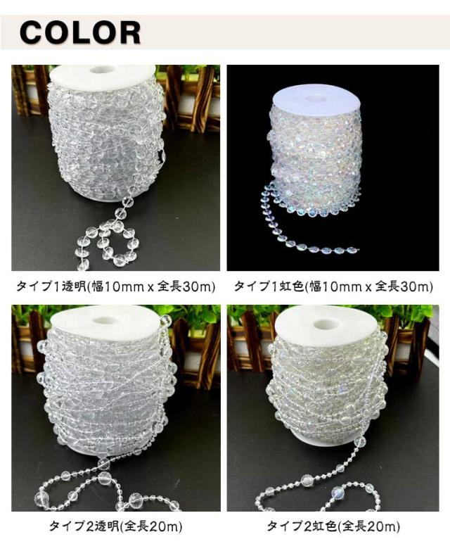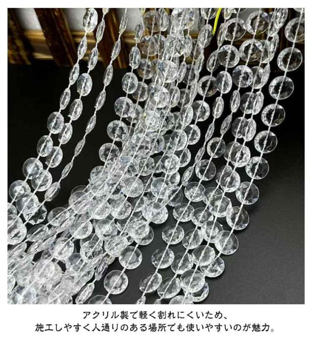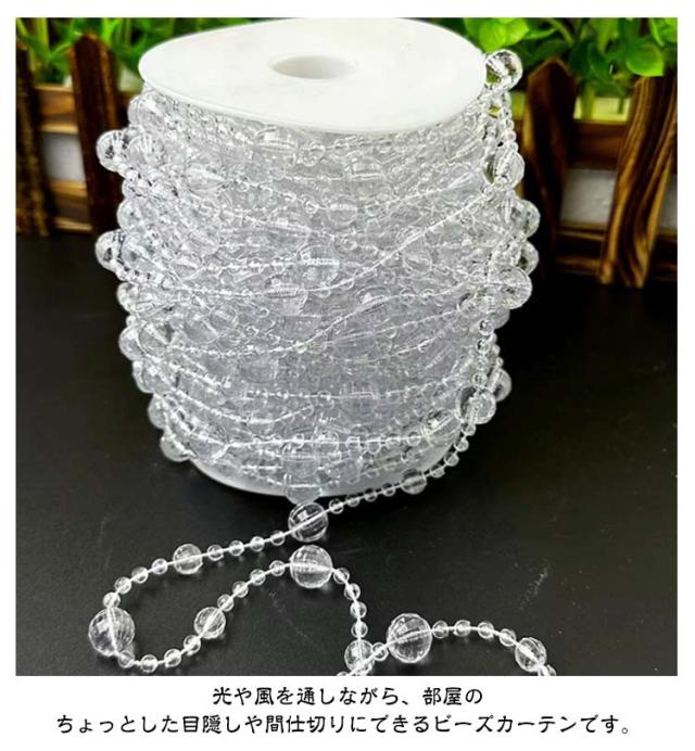 | 選べる2タイプx2色 透明感が美しく、光をキラキラと反射するビーズカーテン30mです。 アクリル製で軽く割れにくいため、施工しやすく人通りのある場所でも使いやすいのが魅力。 好きな長さにカットでき、ビーズが落ちない仕様です。 光や風を通しながら、部屋のちょっとした目隠しや間仕切りにできるビーズカーテンです。 お部屋の装飾や店舗内のディスプレイ、結婚式やパーティーなどの飾り付けに | |