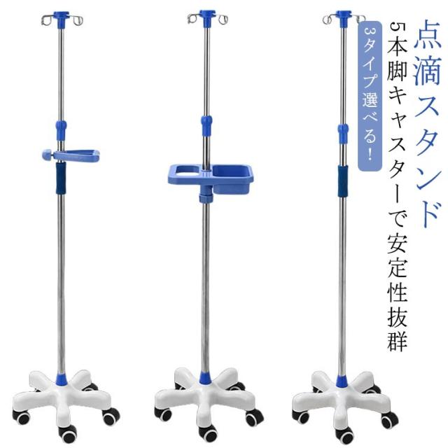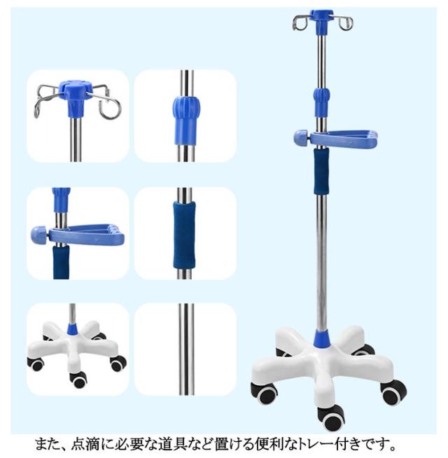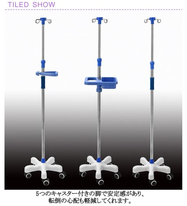| 3タイプ選べる!点滴スタンド 5本脚キャスターで安定性抜群 高さ調節可能 5つのキャスター付きの脚で安定感があり、転倒の心配も軽減してくれます。 360°スムーズに移動が可能です。 また、点滴に必要な道具など置ける便利なトレー付きタイプもあります。 自由に調節が可能!子供から大人まで、ご使用頂く方の身長や使用場所に合わせて自由に高さを変更できます。 適用範囲は病院 療養院 診療所 家庭 コミュニティ 家庭看護 診療所 ペット診療所 美容院など。 | |