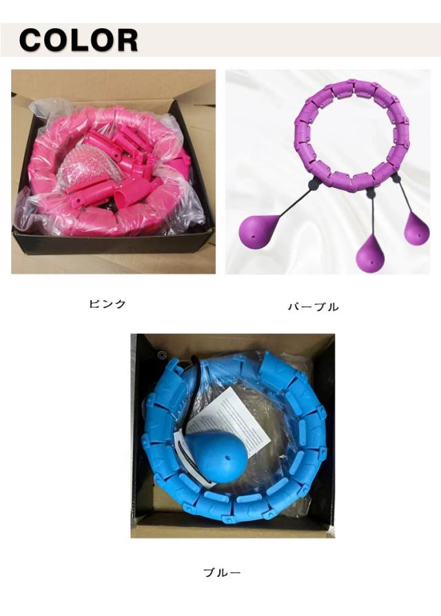 | 【理想的な腰のくびれを速成】フラフープを回すことにより、腰部と太ももが引き締め出来ることではなく、腰痛防止、骨盤矯正、マッサージで基礎代謝を高め、脂肪を燃焼させ、インナーマッスルが強化され、キレイなくびれの作り、便秘解消にも効果があります!毎日スマートフラフープを30分程で使用には完璧なスタイルになる近道です。 【脂肪燃焼の高速化】通常のフラフープの2〜3倍の速さで脂肪を燃焼させます。ウエストを強化するためには1日30分程、フラフープを使用することがオススメです。週5回、毎回30分以上スマートフラフープの使用は800カロリーを消耗出来ます。毎日20分のスマートフラフープの運動は、30分の水泳、45分のヨガ、30分のランニングで消耗した熱量相当です。 【調節可能なサイズ&回転効果を高める】サイズは自由に調節できます。自分のウエストサイズに合わせて、フラフープの一節を取り付けたり、取り外すことで、サイズを調整出来ます。重量ハンマーにより、回転効果を高めます。また、従来のスマートフラフープより、より簡単に組み立てます。 【マッサージ効果】使用時にマッサージ効果があり、磁気部品を使用すると、体重を減らしたりマッサージしたりするのに適した健康になります。 | |