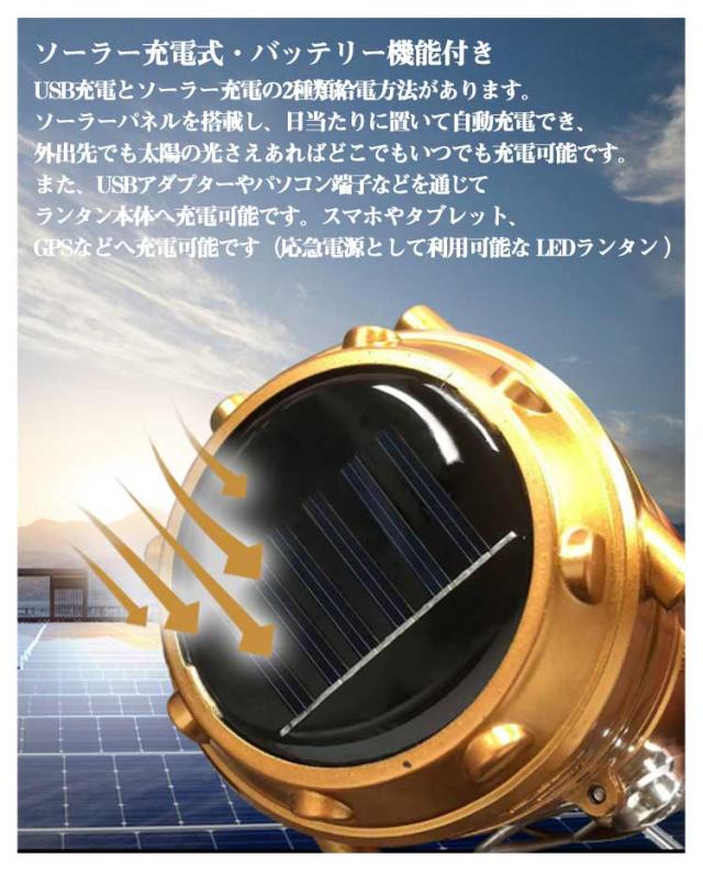 | 【LEDライト 高輝度】防水多機能ソーラーライトハイパワーの強力な光芯を搭載しており、光は明るく、照射距離も長いです。生活防水性能で、どんな嵐でも明るい照明を提供します。普段使いはもちろん、夜釣り、バーベキュー、車中泊、キャンプ、登山、防犯、防災、夜間作業時、停電時、非常時、緊急時などにもおすすめ。 【ソーラー充電式・バッテリー機能付き】USB充電とソーラー充電の2種類給電方法があります。ソーラーパネルを搭載し、日当たりに置いて自動充電でき、外出先でも太陽の光さえあればどこでもいつでも充電可能です。また、USBアダプターやパソコン端子などを通じてランタン本体へ充電可能です。スマホやタブレット、GPSなどへ充電可能です(応急電源として利用可能な LEDランタン ) 【3つの使用方法】防水多機能ソーラーライトはキャンプライトモード、ポータブルライトモード、サーチライトモードに分かれています。ランタンのようにランプ本体を伸縮させることで長さを変えることができ、広げるとソーラーランタンになり、折りたたむと懐中電灯になります。 【簡単操作・直感的な使用感】老若男女問わず使いやすいシンプルな操作性。引き上げるだけで点灯し、閉じるだけで消灯する直感的な設計となる キャンプランタン は、ボタン一つで明るさやモードの切替が可能で、初めての方でも迷わずに使用できます。 【アウトドア向けのキャンプランタンです】ハンドル付きで引き伸ばせばキャンプランタンになり、卓上置きや、テント内に吊り下げて使えます。持って、置いて、吊り下げて、設置方式多様で使い勝手抜群、アウトドア用、非常用、防災用などに活躍してくれます。 | |