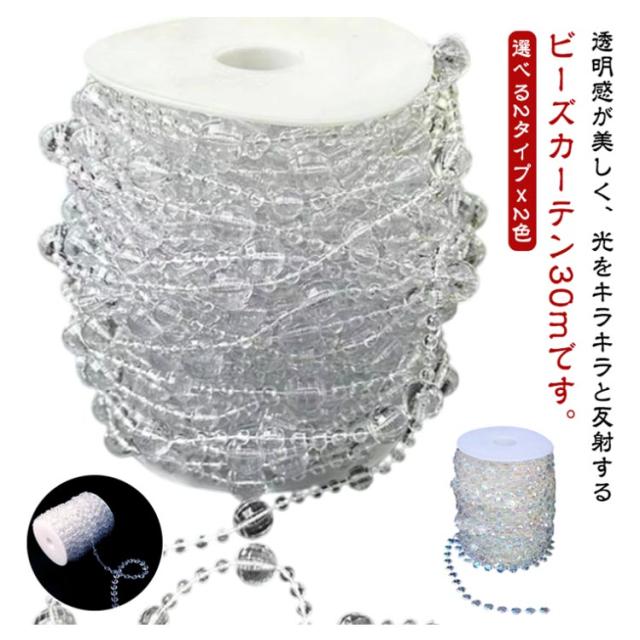 | 選べる2タイプx2色 透明感が美しく、光をキラキラと反射するビーズカーテン30mです。 アクリル製で軽く割れにくいため、施工しやすく人通りのある場所でも使いやすいのが魅力。 好きな長さにカットでき、ビーズが落ちない仕様です。 光や風を通しながら、部屋のちょっとした目隠しや間仕切りにできるビーズカーテンです。 お部屋の装飾や店舗内のディスプレイ、結婚式やパーティーなどの飾り付けに | |