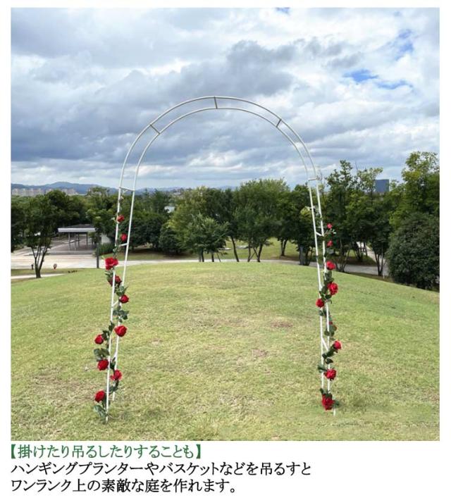 | 【お庭に華やかなインテリアアーチを】 薔薇やつる性の植物を支柱に絡ませるだけで玄関やお庭が華やかに! シンプルなデザインと対照的な丸み曲線でどの角度から見てもお花を綺麗に魅せられます。 【頑丈なスチール製】 頑丈なスチール製です。耐食性や耐候性がある粉体塗装を施しています。 【掛けたり吊るしたりすることも】 ハンギングプランターやバスケットなどを吊るすとワンランク上の素敵な庭を作れます。 【用途】 玄関 庭 結婚式 誕生日パーティー クリスマス 野外コンサート イベントなど | |