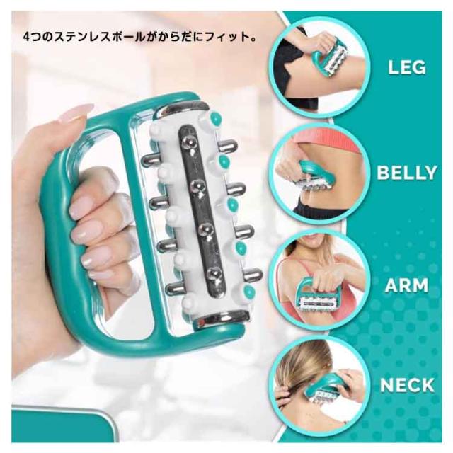 | 力を入れなくても、適度な圧でツボを心地よく刺激するマッサージローラー。 4つのステンレスボールがからだにフィット。 まるで手指やこぶしのようなグリグリ感。 気になる部位にゴロゴロするだけ。イボイボ突起が心地いい。 バンド付きなので、手にはめて簡単にマッサージできがます。 ジムにも持ち運びができるコンパクトサイズです。 お宅、オフィス、ヨガ教室、ジムなど、いろんな場所で使えます。 | |