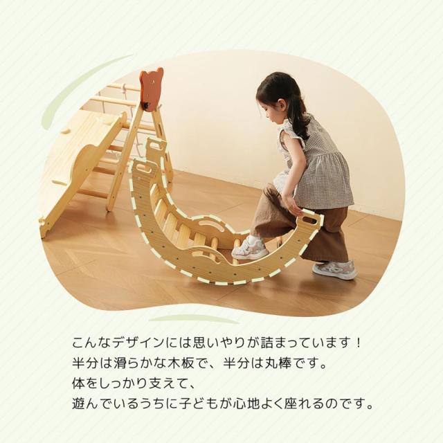 【こんなデザインには思いやりが詰まっています!】半分は滑らかな木板で、半分は丸棒です。体をしっかり支えて、遊んでいるうちに子どもが心地よく座れるのです。