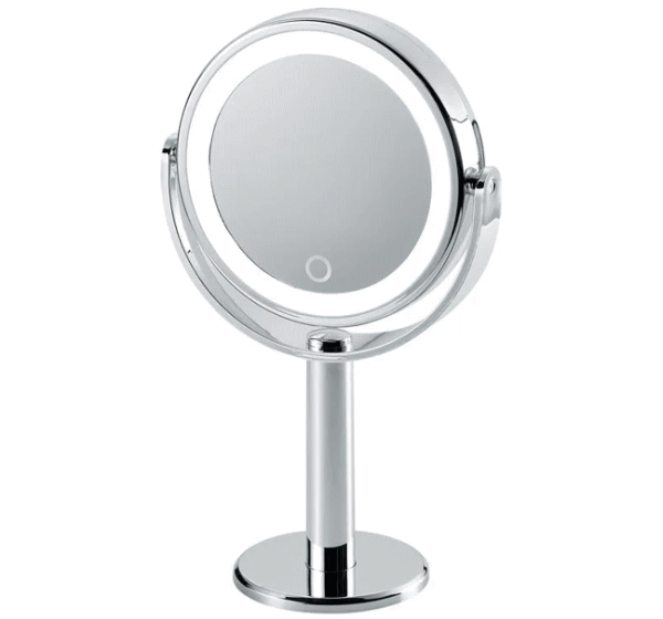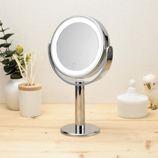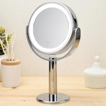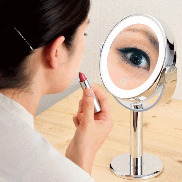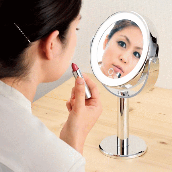 ミラーフレームにLEDライト内蔵で細部まではっきりと明るく照らします。両面ミラーでくるっと回転し等倍と5倍鏡を簡単に使い分けできます。タッチ式のスイッチでLEDライトが点灯・消灯ができ長押しすれば調光可能!電源はコードレスの持ち運びも楽々な電池方式。■品番AY-2033■品名:LEDコスメティックミラー■内容:本体■主な材質:ABS樹脂(UV塗装)、ガラス■仕様:アルカリ単4形乾電池3本使用(別売)■サイズ185×108×H315mm(ミラー部径128mm)■重量425g■生産国:中国
