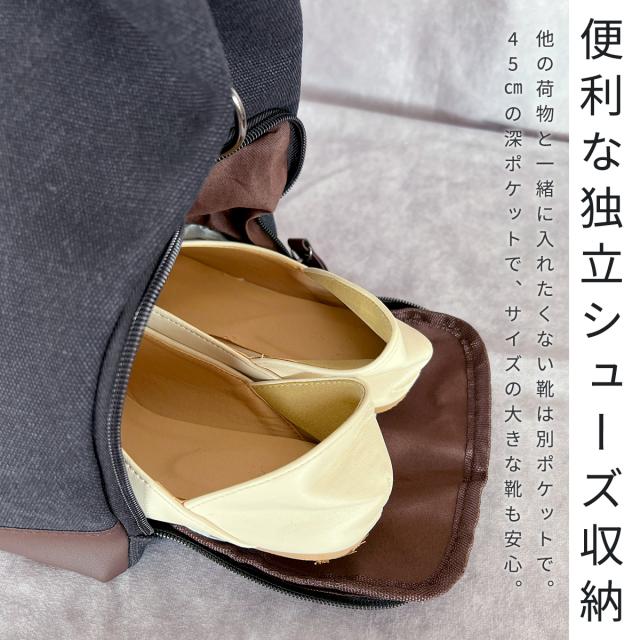 靴を分けてしまえるシューズ収納ポケット付き。床置きも安心底鋲付き!丈夫で軽いキャンバス帆布素材