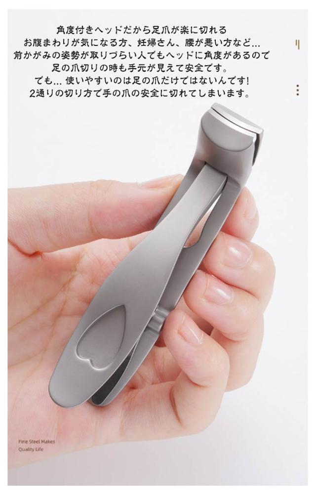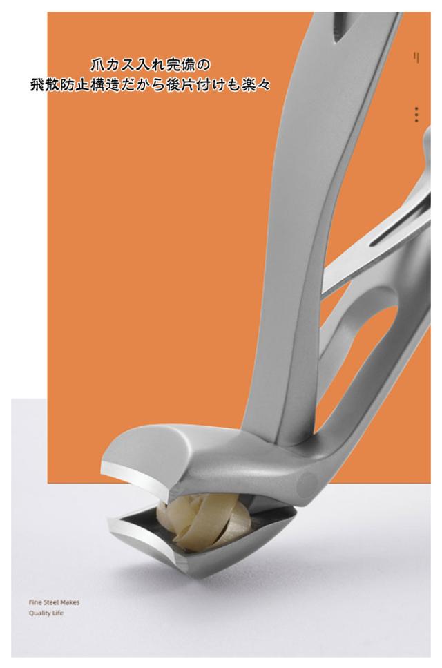 | 角度付きヘッド爪切りで 足の爪切りの苦しさから解放! ●角度付きヘッドだから足爪が楽に切れる ●爪カス入れ完備の飛散防止構造だから後片付けも楽々 ●最大8mmの大開口部だから分厚い足爪でも軽い力で切れる ポイント01 角度付きヘッドだから足爪が楽に切れる お腹まわりが気になる方、妊婦さん、腰が悪い方など... 前かがみの姿勢が取りづらい人でもヘッドに角度があるので足の爪切りの時も手元が見えて安全です。 でも... 使いやすいのは足の爪だけではないんです! 2通りの切り方で手の爪の安全に切れてしまいます。 ポイント02 爪カス入れ完備の飛散防止構造だから後片付けも楽々 抜群の切れ味で分厚い爪でもスパッと切れるから、先端の爪カス入れでしっかりキャッチ! 足の爪切り準備や爪カスの片づけの時間も短縮できちゃいます。 ポイント03 最大8mmの大開口部だから分厚い足爪でも軽い力で切れる 普通の爪切りだと開口部が3mm程度だから、分厚い爪だと挟めないなんてことも... 角度付きヘッド爪切りなら開口部最大8mmなのでどんな分厚い爪にも対応できちゃいます。 しかもニッパーのような切れ味だから軽い力で分厚くなってしまった爪や変形爪でもスパッとカット! 角度式ヘッド爪切りのトリセツ 01爪切りを取り出す 02爪切りのハンドルを開く 03付属のフリップを刃の方向に倒す 04完成 | |