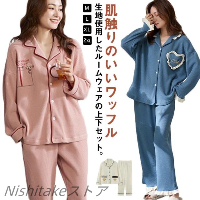 上下セット レディース ワッフル生地 肌触り柔らか 部屋着 綿 秋 冬 長袖 セットアップ 春 コットン パジャマ かわいい ルームウェア 前開き 女性 胸ポケット 寝間着 寝巻き プレゼント ナイトウエア パジャマ