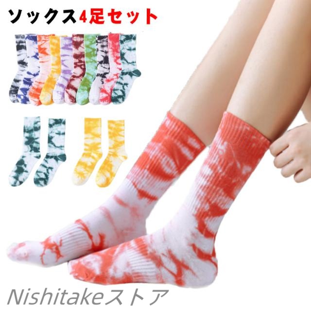 原宿系 ユニセックス セット タイダイ染め ロング丈 靴下 4足組 靴下 通学 スポーツソックス ミドルソックス ストリート系 スケート メンズ アメカジ レディース アウトドア ジム グラデーション 通勤 ソックス