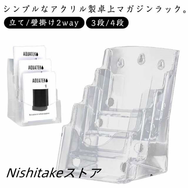 | シンプルなアクリル製卓上マガジンラック。【A4/A5サイズ】【3段/4段】【立て/壁掛け2way】 【高品質カタログスタンド】A4、A5サイズの冊子がぴったり収まるカタログスタンドです。オフィスやショップの受付カウンターに最適なデザインです。 【多用途パンフレットスタンド】カタログ、パンフレット、チラシ、書類ケースとしても使える汎用性の高いアイテムです。展示会やイベントでも活躍します。 【スタイリッシュなデザイン】透明なアクリル素材を使用し、どんなインテリアにもマッチするシンプルでおしゃれなデザインです。 卓上のパンフレットラックやチラシスタンド、マガジンラックとしても利用可能です。 | |