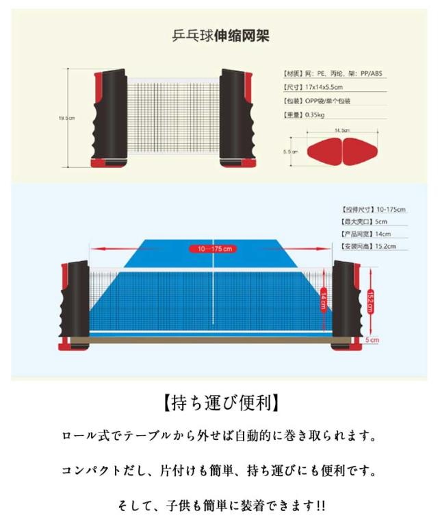 | 【伸縮タイプ・2個セット】伸縮式卓球ネットなので、十分なサイズのテーブルがなくても簡単にセッティングでき、すぐに卓球を楽しめます。伸縮式ネットは最長170cm、厚さ5cmまでのテーブルに設置可能です。 【取り付け簡単】使い方は挟んで伸ばすのだけなので、テーブルだけあれば、取り付けも簡単でどこでも遊べます。挟む力が十分なので、厚さ5cmまでのテーブルにしっかり滑り止めができます。 【持ち運び便利】ロール式でテーブルから外せば自動的に巻き取られます。コンパクトだし、片付けも簡単、持ち運びにも便利です。そして、子供も簡単に装着できます?? 【友達や家族との時間をENJOY】テーブルだけあれば、どこでも遊べてすごく盛り上がって楽しめます。子ども会やホームパーティーなどのイベントで大活躍! | |
