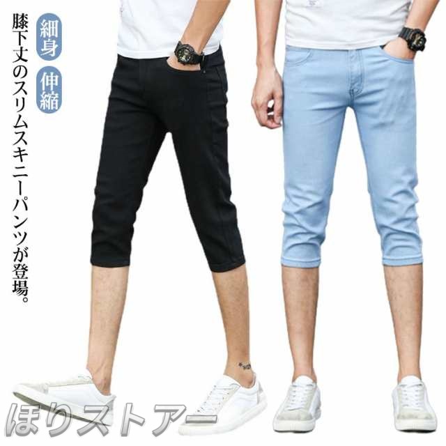 デニム スキニーパンツ 7分丈 メンズ デニム ハーフパンツ 膝下丈 ショートパンツ クロップドパンツ スキニー スリム 細身 デニムパンツ ストレッチ 伸縮 薄手 夏 春 カジュアル 大人 黒 ブルー 大きいサイズ M L XL 2XL 3XL