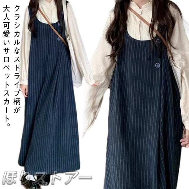 レディース ゆったり ジャンスカ ジャンパースカート ワンピース ストライプ柄 サロペット スカート ボタンデザイン ロング サロペットスカート キャミソールワンピース 春 ロングワンピース サロペットスカート ワイド 体型カバー 大人 カジュアル おしゃれ ネイビー 紺