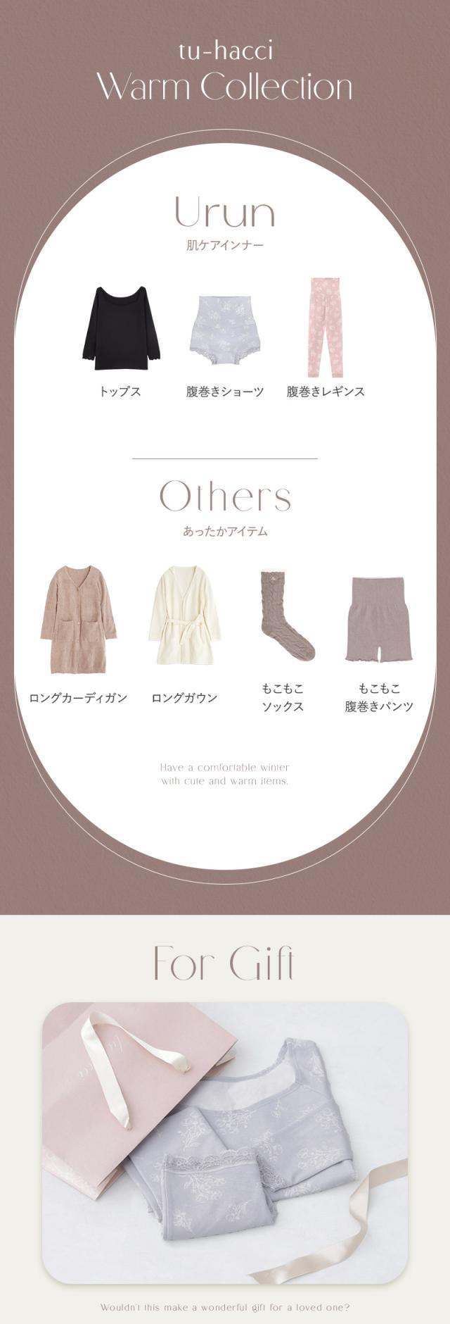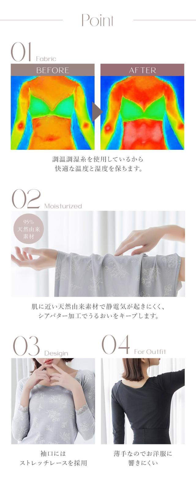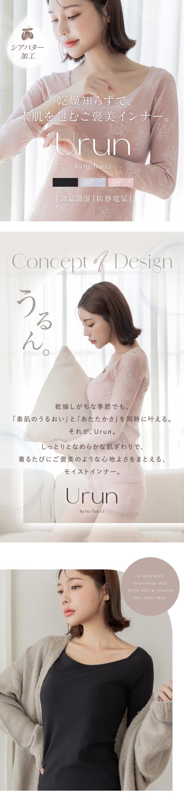 tu-hacci Inner Collection 長袖インナートップス単品 しっとり、なめらか。 うるおい仕立てのモイストインナー《Urun》 乾燥しやすい季節でも、 「素肌のうるおい」と「あたたかさ」を両立。 それが《Urun》。 しっとりなめらかな肌ざわりで、 まとうたびに心まで満たされる、肌ケアインナーです。 【こんな方におすすめ】 ・肌が乾燥してかゆくなりやすい方 ・静電気が気になる方 ・着ぶくれを避けたい方 ■ご褒美のような“あったかインナー” ・調温調湿糸を使用し、季節を問わず快適な温度と湿度をキープ ・静電気が起きにくい綿混の天然由来素材を採用 ・シアバター加工で、うるおいを逃がさない ・腰回りまで包み込む長め丈で冷え対策にも◎ ■ファッションの邪魔をしないデザイン ・襟ぐり広めのラウンドネックで、首元の開いたトップスとも好相性 ・ブラ紐固定テープ付きで、ブラ紐見えの悩みにも対応 ・袖口から見えにくい9分袖デザイン ・着ぶくれせず、アウターにラインが響きにくい薄手設計 袖口のストレッチレースで見た目も上品に。 プチギフトにもおすすめです。 ≫ ギフトラッピングはこちら ≪ |