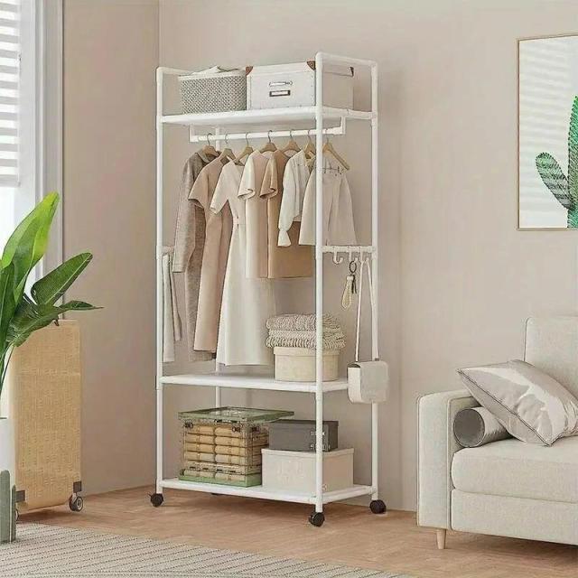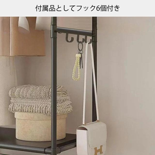 多機能収納:掛ける・置く・引っ掛けるが一台で可能。衣類、バッグ、収納ボックスなどをすっきり整理。