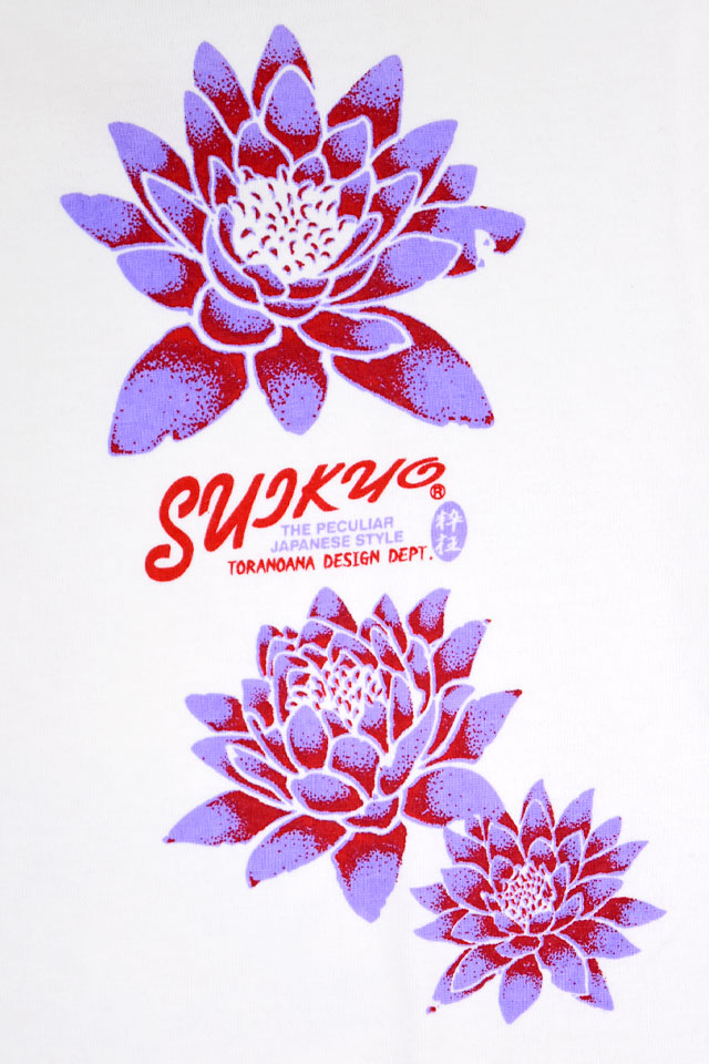 エフ商会が運営する虎の穴デザイン事務所から誕生した「粋狂」より、半袖Tシャツ「睡蓮と鯉」(SYT-209)のご紹介です。 今回は、睡蓮と鯉をモチーフの主役に採用しました。 背中には、美しい睡蓮の中を優雅に泳ぐ鯉をデザイン。 それぞれのボディーカラーに合わせて、用いる色味にも変化を持たせ、異なる表情に仕上げました。 右袖には蓮をワンポイントでプリント、左袖には布タグを縫い付けました。 生地には、肌触りの良い粋狂さんお馴染みのよれにくいタフなボディーを採用。 | |||||||||||||||||||||||||