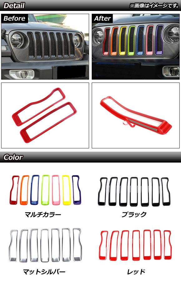 フロントグリルカバー ジープ ラングラー JL ルビコン用 2018年〜2023年 マルチカラー ABS製 入数:1セット(7個) AP-FG543-RGB