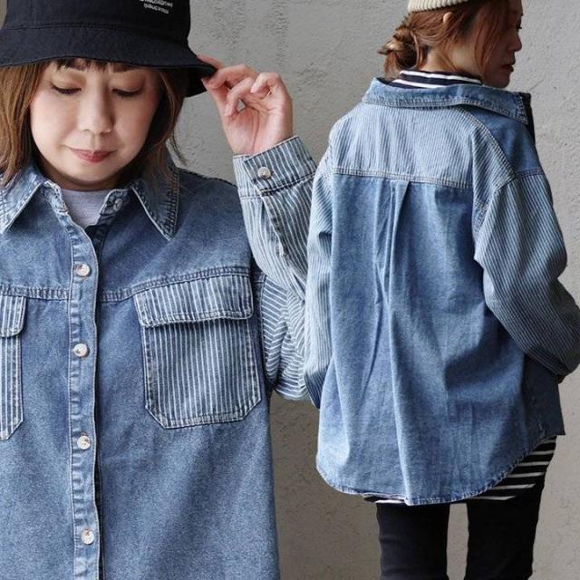 デニムシャツ ヒッコリー 長袖 レディース 薄手 軽い ゆったり お尻 体型 カバー 大きいサイズ レギュラーカラー コットン ポリエステル デニム 切替 クレイジー 胸ポケット カジュアル ヴィンテージ アメカジ パティ