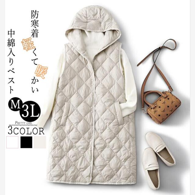 キルティングベスト 中綿ベスト ダウンベスト ロングベスト インナーベスト レディース コート ベスト アウター フード ロング ノースリーブ 大きめサイズ 羽織り 防寒 量軽 秋 冬 M L 2L 3L