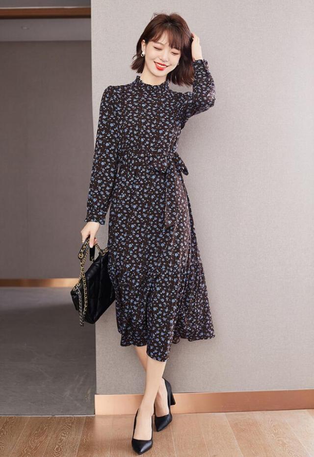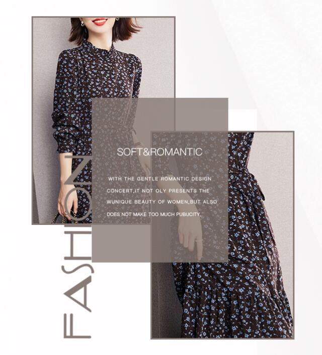 ギャザーワンピース フラワーワンピース フリルネック フラワー ロング マキシ丈 Aライン 体型カバー 長袖 着やせ 大きいサイズ レディースワンピース オシャレ 春 秋 S M L 2L 3L