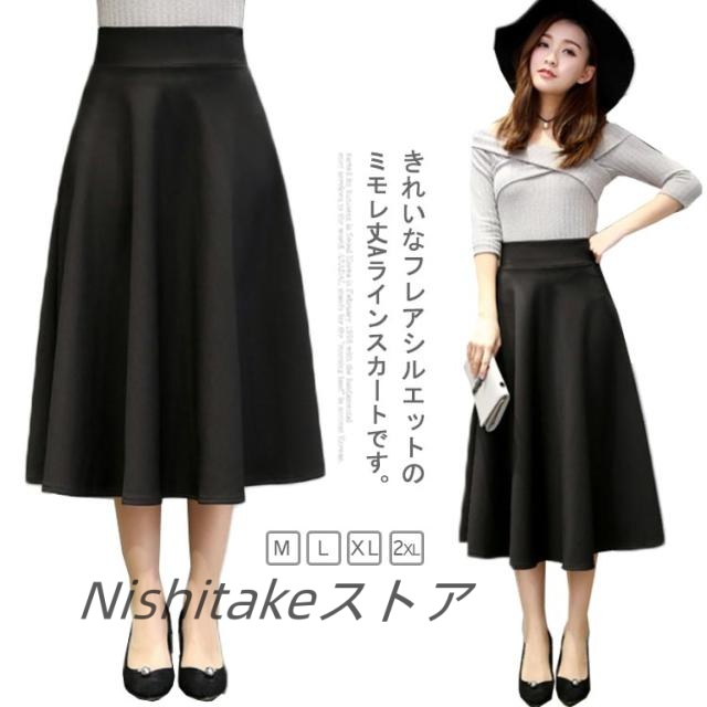 スカート 秋 膝下 レディース 冬 パーティー ロング 上品 ハイウエスト ミモレ丈スカート ストレッチ フレアスカート 大きいサイズ ブラック オフィス カジュアル Aライン