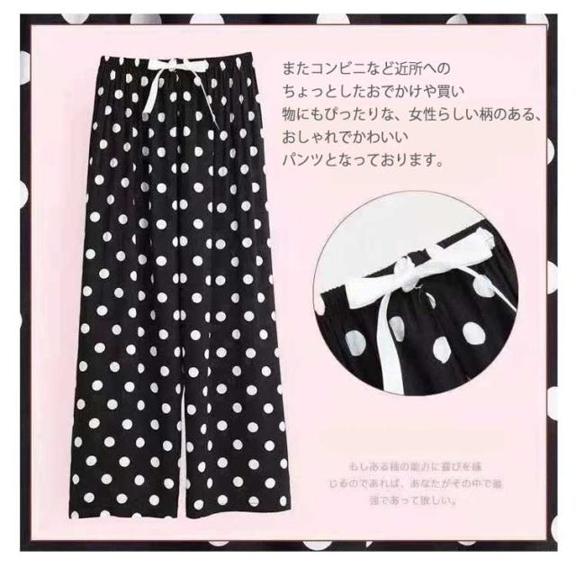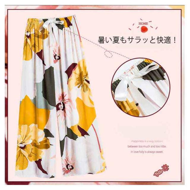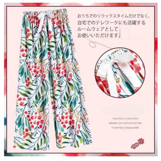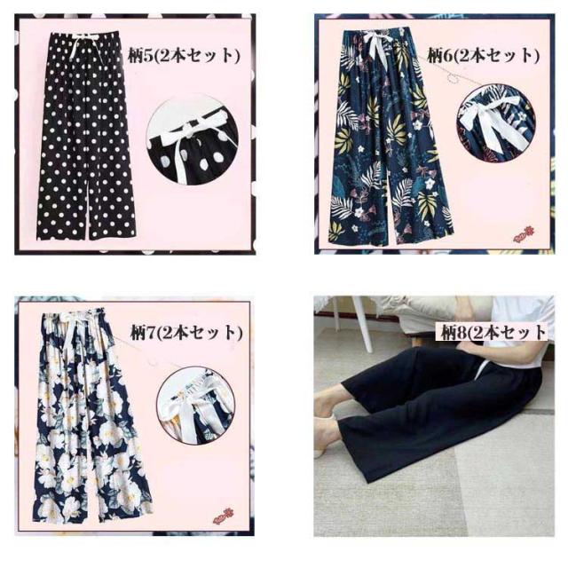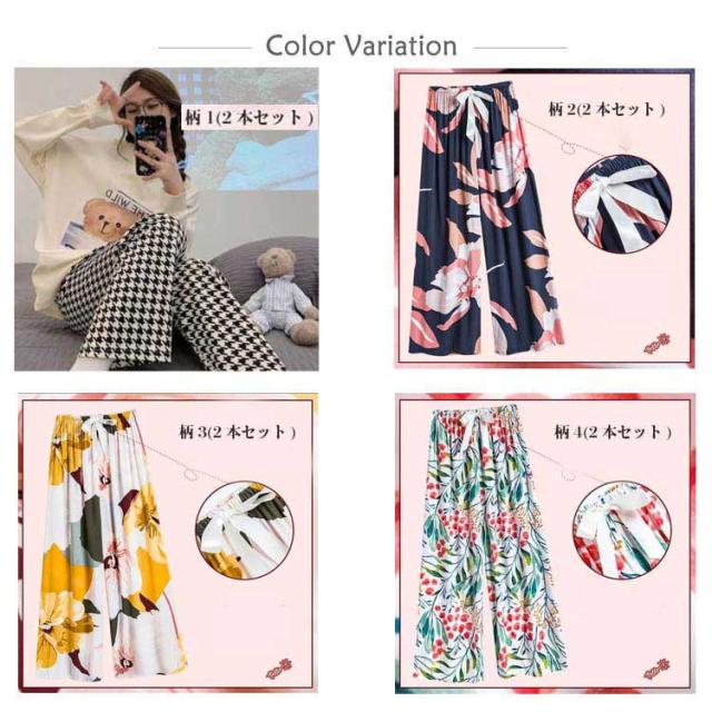 | 暑い夏もサラッと快適!レディース用ワイドパンツ2本セットです。 綿のような柔らかい素材を採用します。 風通しが良く、やわらかくて涼しげな生地となっています。 ウエストにはソフトなゴムが入っており、締め付け過ぎないのにずり落ちません。 おうちでのリラックスタイムだけでなく、自宅でのテレワークにも活躍するルームウェアとしてお使いいただけます。 またコンビニなど近所へのちょっとしたおでかけや買い物にもぴったりな、女性らしい柄のある、おしゃれでかわいいパンツとなっております。 | |