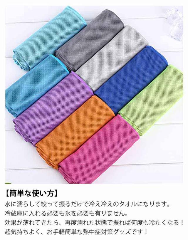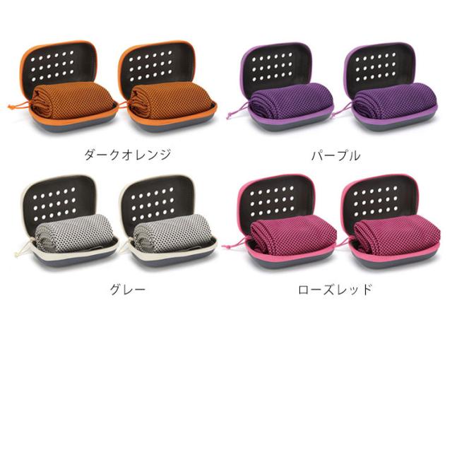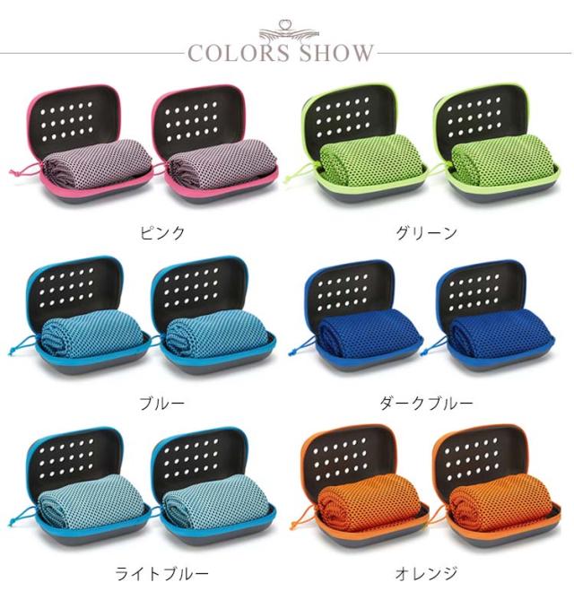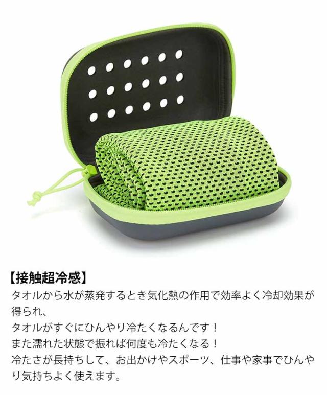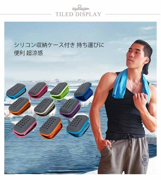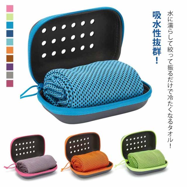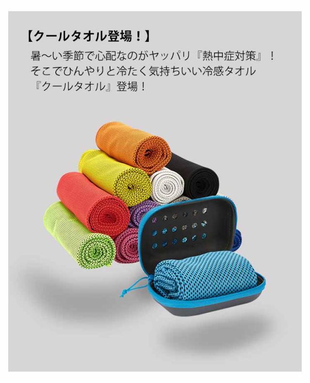 | 水に濡らして絞って振るだけで冷たくなるタオル! 吸水性抜群! シリコン収納ケース付き 持ち運びに便利 超涼感 【クールタオル登場!】 暑?い季節で心配なのがヤッパリ『熱中症対策』! そこでひんやりと冷たく気持ちいい冷感タオル『クールタオル』登場! 【簡単な使い方】 水に濡らして絞って振るだけで冷え冷えのタオルになります。 冷蔵庫に入れる必要も氷を必要も有りません。 効果が薄れてきたら、再度濡れた状態で振れば何度も冷たくなる! 超気持ちよく、お手軽簡単な熱中症対策グッズです! 【吸水性と通気性抜群】 汗を拭いたときさらっと冷感とも合わさって、気持ちよく使えるポイントに! タオルは水や汗に濡れるとひんやり冷たくなります。 糸特殊異形断面の糸になっていて、水や汗をすばやく吸収拡散! 【優しい肌触り】 タオルの素材は肌触りさわやかなマイクロファイバー素材です。 手に取って触るだけでひんやり気持ちいい! 【接触超冷感】 タオルから水が蒸発するとき気化熱の作用で効率よく冷却効果が得られ、 タオルがすぐにひんやり冷たくなるんです! また濡れた状態で振れば何度も冷たくなる! 冷たさが長持ちして、お出かけやスポーツ、仕事や家事でひんやり気持ちよく使えます。 【洗濯機の注意事項】 ・お洗濯機の際は、ネットに入れ、高温を避け30℃以下の水で洗濯をしてください。 ・洗濯時に漂白剤を使用しないでください。冷感効果に影響する恐れがあります。 ・稀に色移りする恐れがありますので、淡色の衣類と一緒に選択しないでください。 ・乾燥機、アイロンの使用は避けてください。 | |