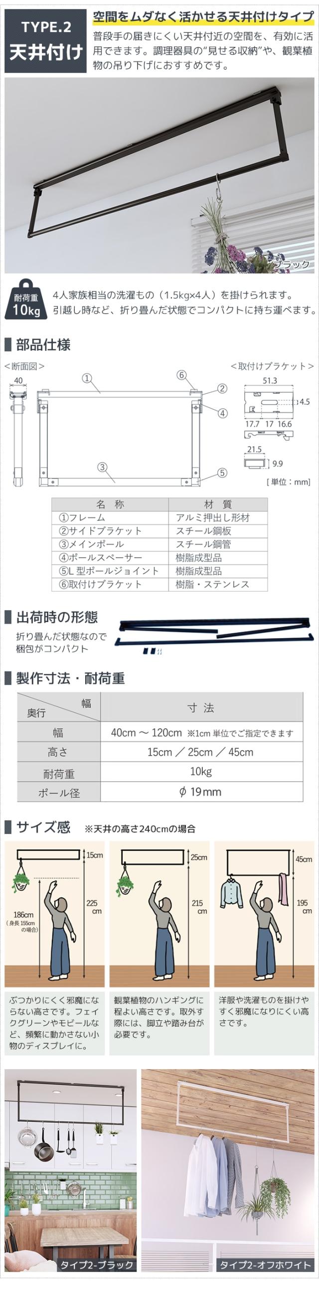 インテリアバー フリーハング (R) タイプ2<天井付け> 奥行15cm / 25cm / 45cm × 幅81〜120cm以内でサイズオーダー 1cm単位 日本製 ハンギングバー 室内干し 部屋干し ランドリーバー ディスプレイ おしゃれ インテリア タチカワ 立川機工 2年保証 引っ越し 新生活