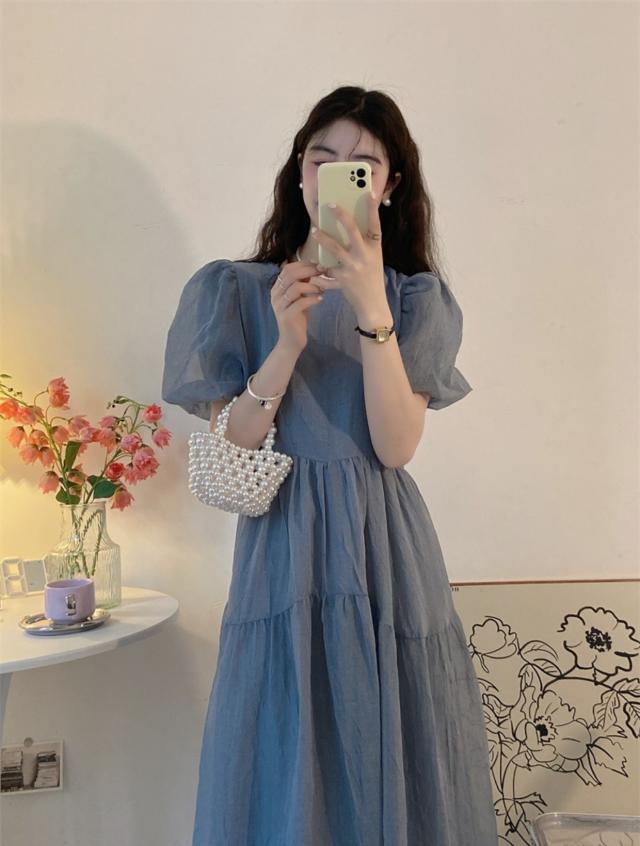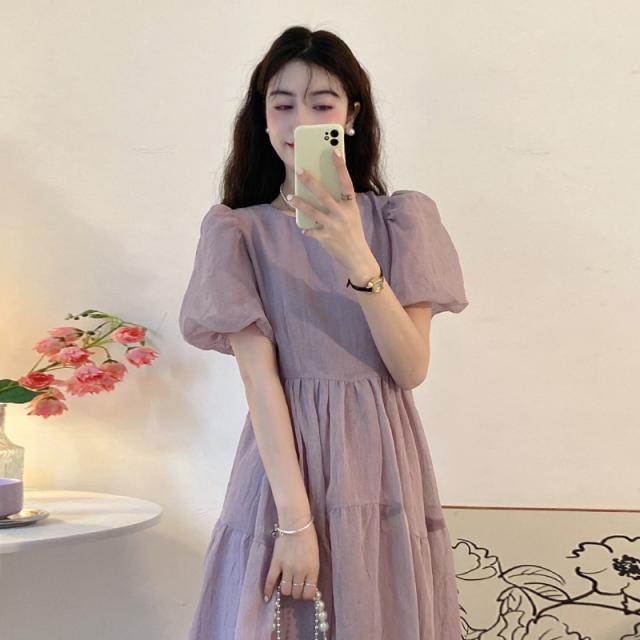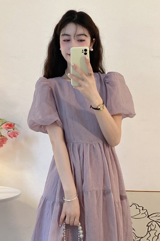 ワンピース レディース ティアード 送料無料 個性的 ミディアム 半袖 バルーン袖 ぽわん袖 ラウンドネック フレア 切り替えデザイン 華奢