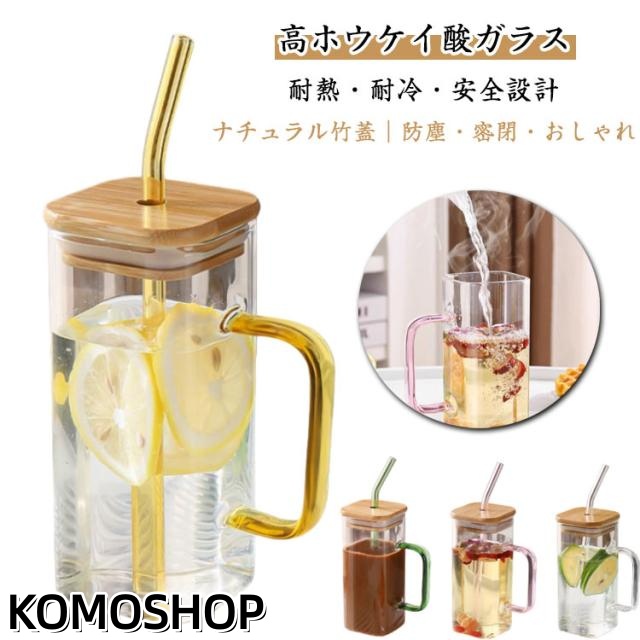 400ml ストロー付きグラス 角型取っ手付き 耐熱グラス 竹蓋コップ おしゃれ ガラスコップ マグカップ 角型ガラスカップ ドリンクグラス