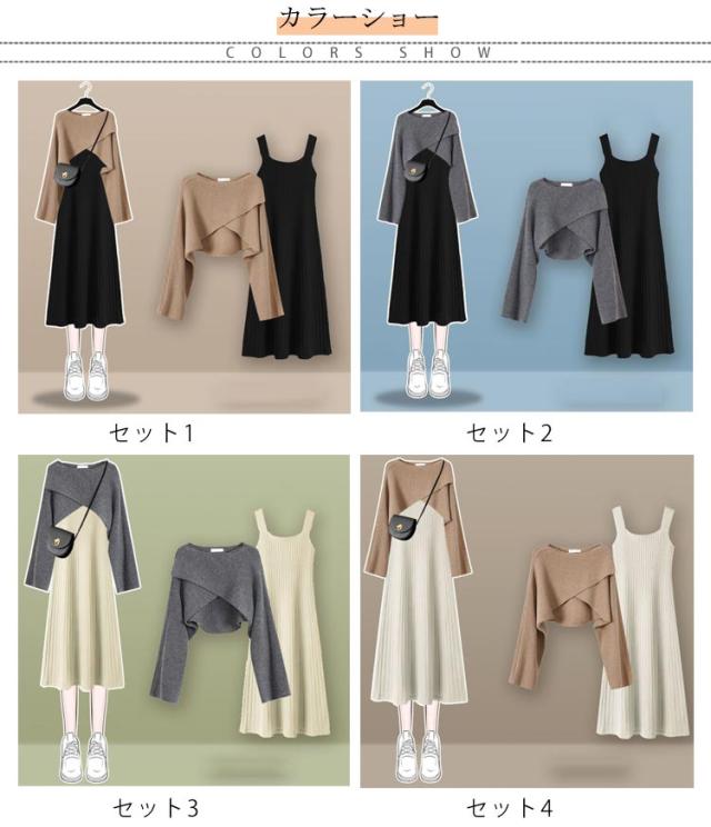 ニット セットアップ レディース 長袖 ニットセーター ニットワンピース セットアップ ノースリーブ Aライン フレアワンピース クロス ニット セーター トップス 上下セット ゆったり 大人 無地 フェミニン カジュアル きれいめ オフィス OL 体型カバー 秋 冬 春 秋服 冬服