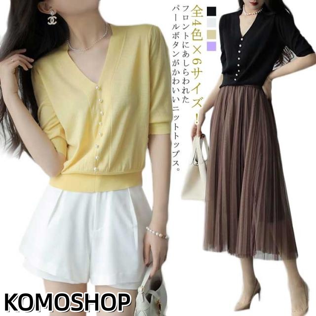 全4色×6サイズ!ニットソー 5分袖 春 ニット トップス 送料無料 レディース サマーニット 半袖ニット vネック パール付き キレイめ オフィス 大人 上品 無地 可愛い 夏 秋