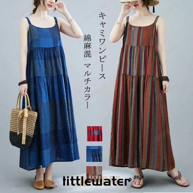 キャミワンピース 綿 麻 ジャンパースカート 春 夏 レディース リネン Uネック プリント ロングワンピース ストライプ レイヤード 総柄 サロペット ワンピース