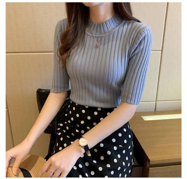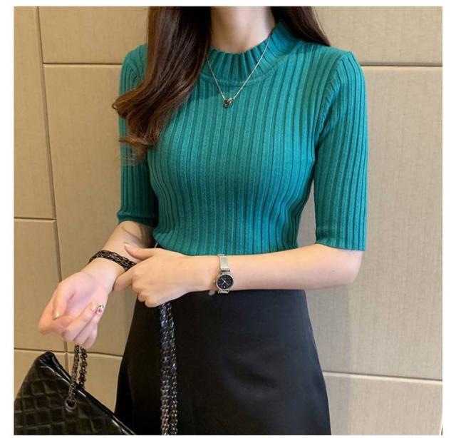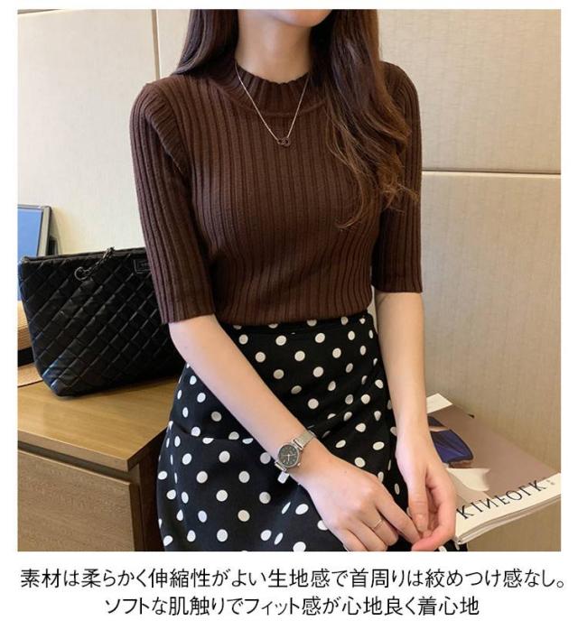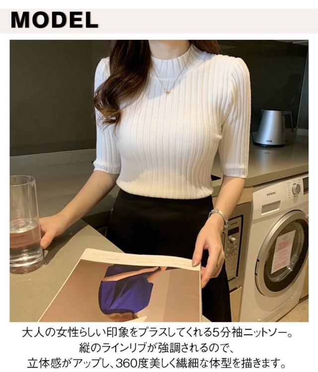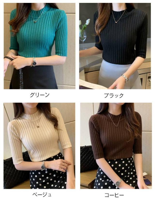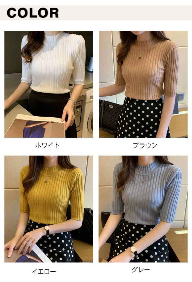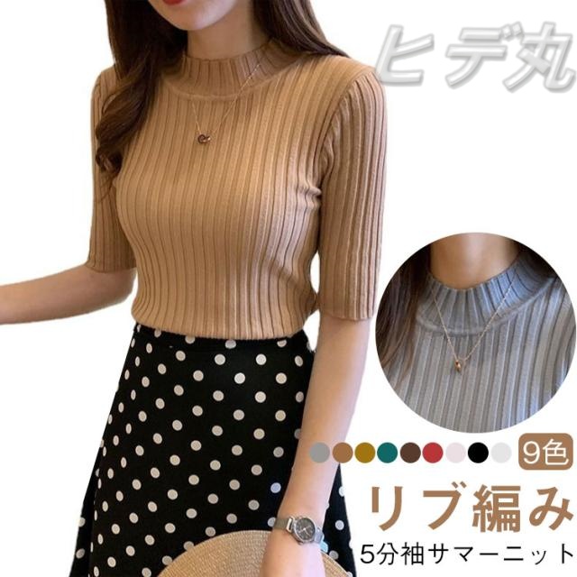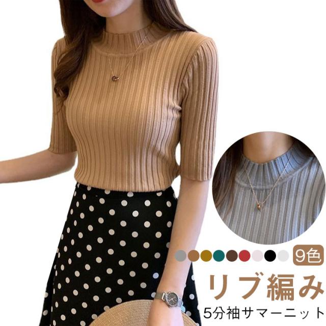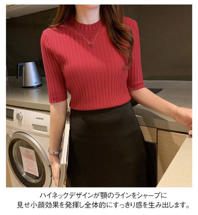 半袖 五分袖 ハイネック 夏 ソフト サマーニット セーター リブニット 高伸縮 トップス インナー ニット 着回し レディース サマーニット 重ね着 薄手 春 秋 大人可愛い