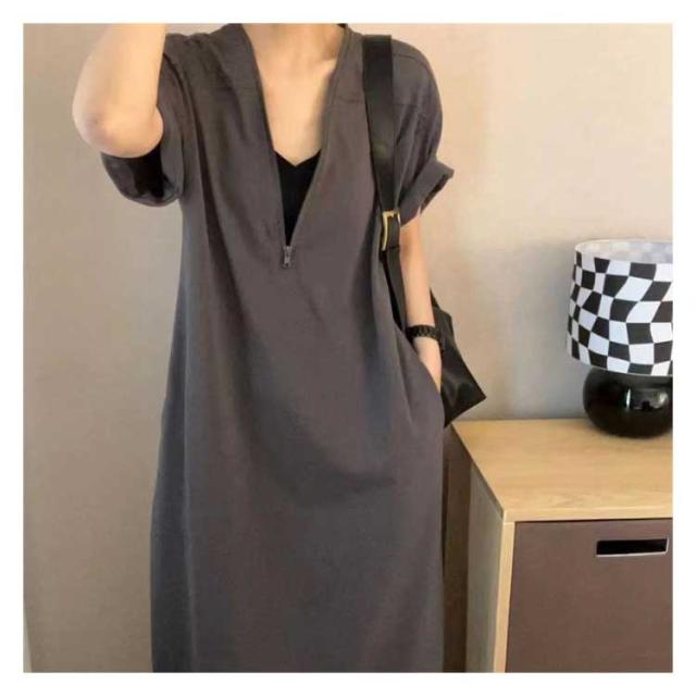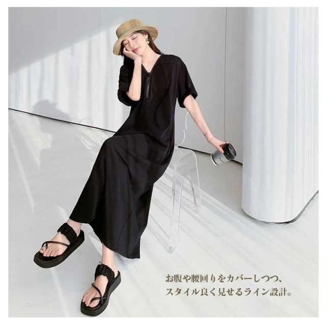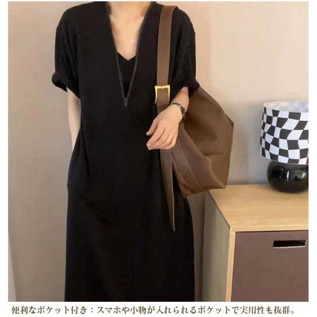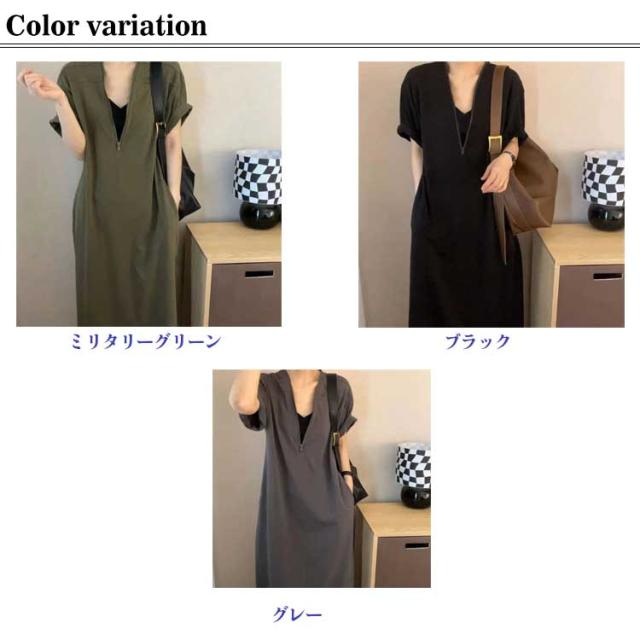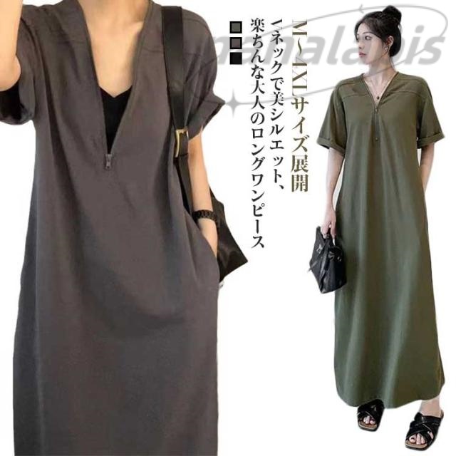 大きいサイズ 秋 Vネック レディース ゆったり ママ カジュアル 無地 ロング おしゃれ 体型カバー Tシャツワンピース 半袖 ファスナー付き ポケット付き シンプル Tシャツワンピース 旅行 リラックス 部屋着 お出かけ 30代 40代