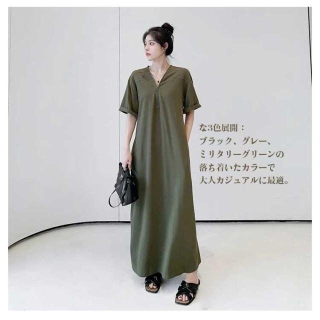 | Vネックで美シルエット、楽ちんな大人のロングワンピース M?4XLサイズ展開 サイズ展開豊富:Mから4XLまで対応し、幅広い体型の方にぴったり。 着痩せ効果のあるVネック:首元をすっきり見せ、小顔効果も期待できるデザイン。 便利なポケット付き:スマホや小物が入れられるポケットで実用性も抜群。 季節を問わず活躍:春夏は涼しく快適に、秋には羽織と合わせてロングシーズン着回し可能。 お腹や腰回りをカバーしつつ、スタイル良く見せるライン設計。 な3色展開:ブラック、グレー、ミリタリーグリーンの落ち着いたカラーで大人カジュアルに最適。 | |