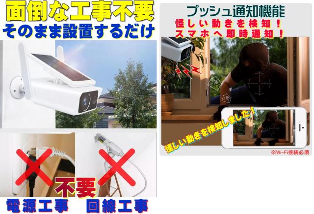 ソーラーパネル搭載+Wi-Fi接続なので面倒な配線工事が必要ありません!