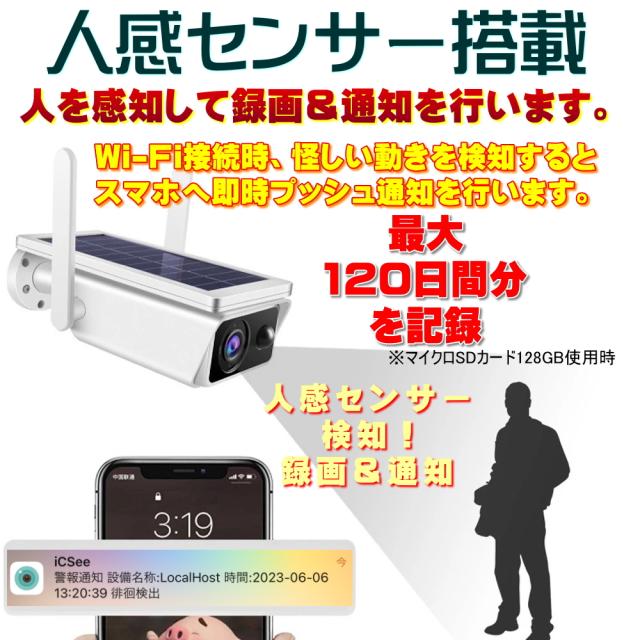 ※ソーラー電源消費を抑えるため、連続録画はできません。人感センサー検知時のみの記録になります。
