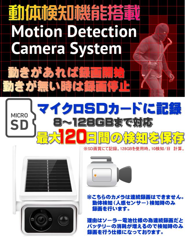 ◆録画はソーラー電池消耗防止システムにより「連続録画」はできません。「動体検知録画のみ」の記録になります◆