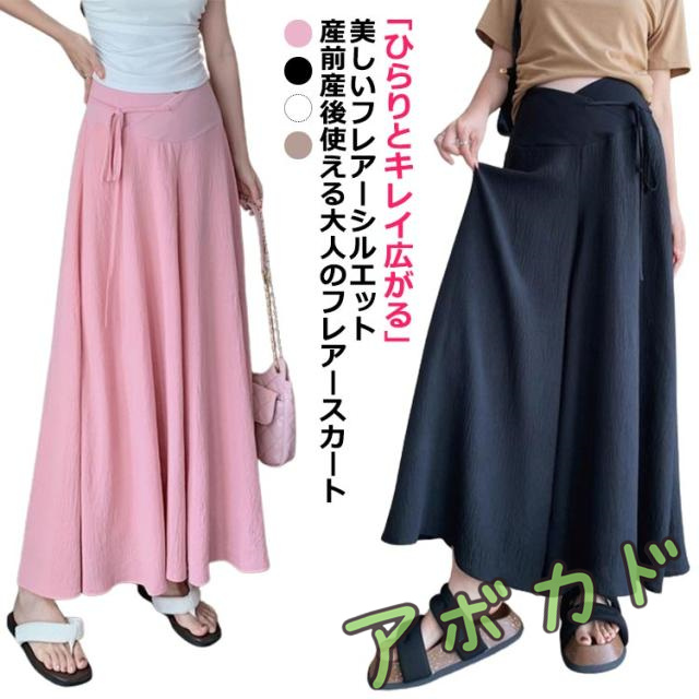 | 「ひらりとキレイ広がる」 美しいフレアーシルエット 産前産後使える大人のフレアースカート ウエスト紐で調整可能、妊娠中から産後まで長くお使いいただけます! | |