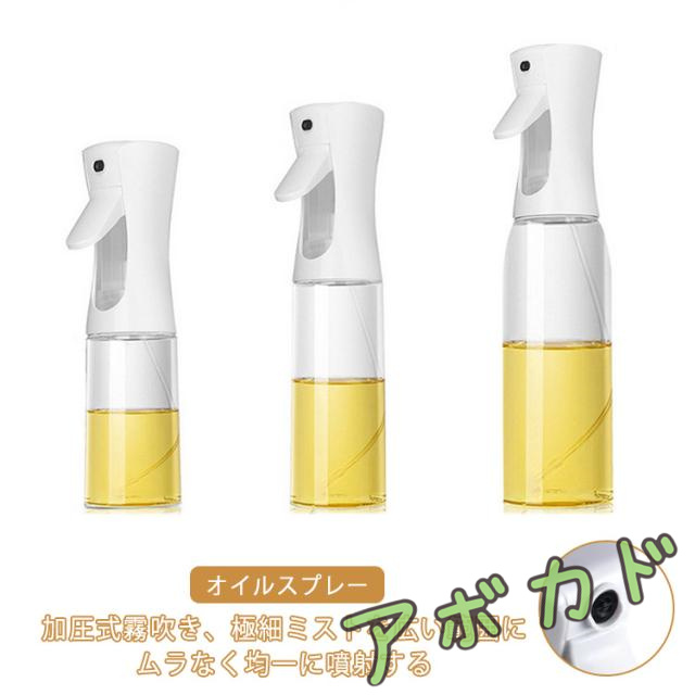 | 加圧式霧吹き、極細ミストを広い範囲にムラなく均一に噴射する。 オイル量を控えて、ヘルシーな生活に。 快適なグリップで、押す手間が省ける。 噴射口のエッジはこぼれ防止設計、ボトルの清潔感を保つ。 オイル、料理酒、しょうゆ、酢など調味料のほか、化粧水やアルコール、植物の水やりにも使える。 | |