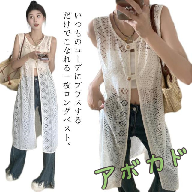 | いつものコーデにプラスするだけでこなれる一枚ロングベスト。 爽やかで繊細な透かし編みニットが季節感のある装いに仕上げてくれます。 前後でこなる表情を楽しめる2way仕様で、その日の気分に合わせられる一枚です。 縦ラインを強調しながら、体型のラインを隠して、着痩せ効果抜群! デザイン性だけでなく、軽い着心地でファッション性も高めてくれる優秀トップスです 。 | |
